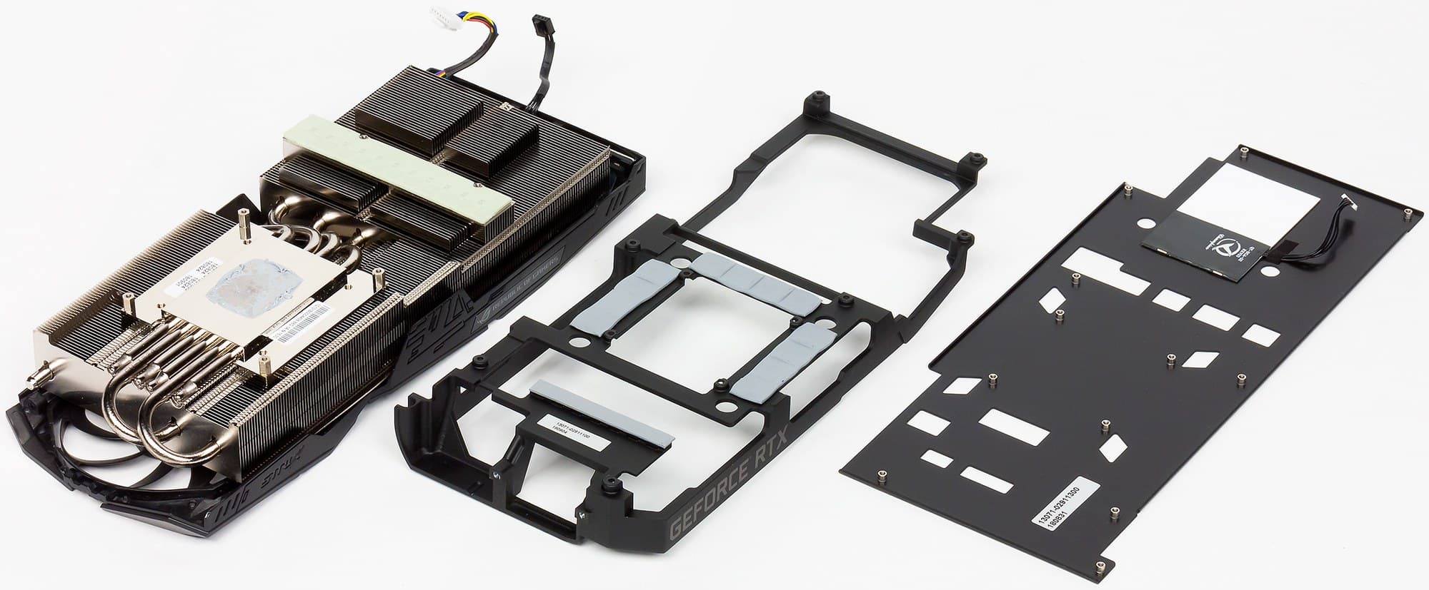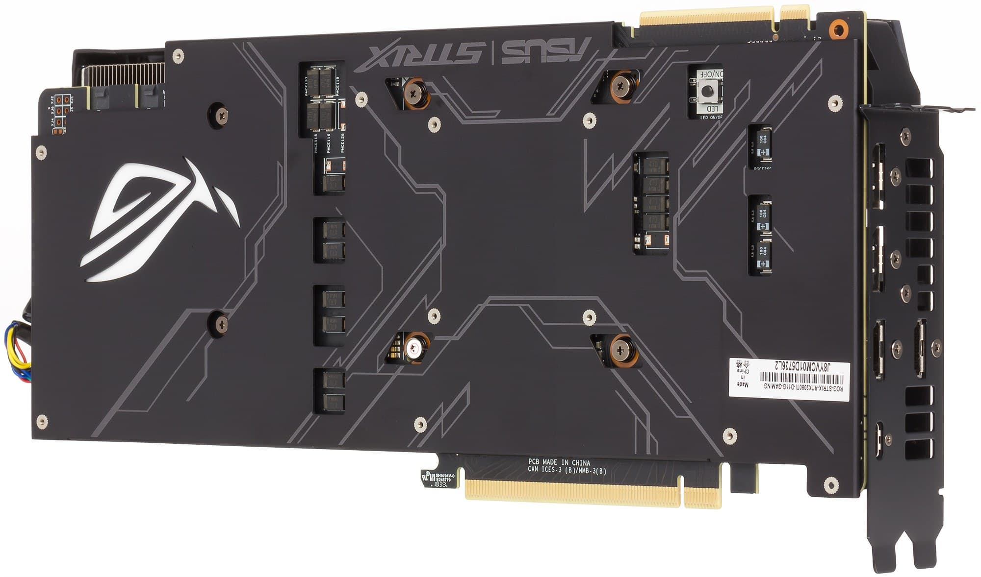Силовые транзисторы охлаждаются вторым радиатором, а к микросхемам памяти прижата через термоинтерфейс рамка кулера, но тепло она практически не отводит. На обороте видеокарты установлена толстая пластина, которая обеспечивает жесткость относительно массивной видеокарты (предотвращая изгиб печатной платы), а также служит дополнительным радиатором для PCB (прижимаясь к ней через термоинтерфейс, который производитель называет самым эффективным). СО оснащена подсветкой, цветом которой можно управлять с помощью вышеупомянутой утилиты Asus GPU Tweak II.