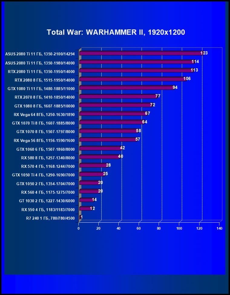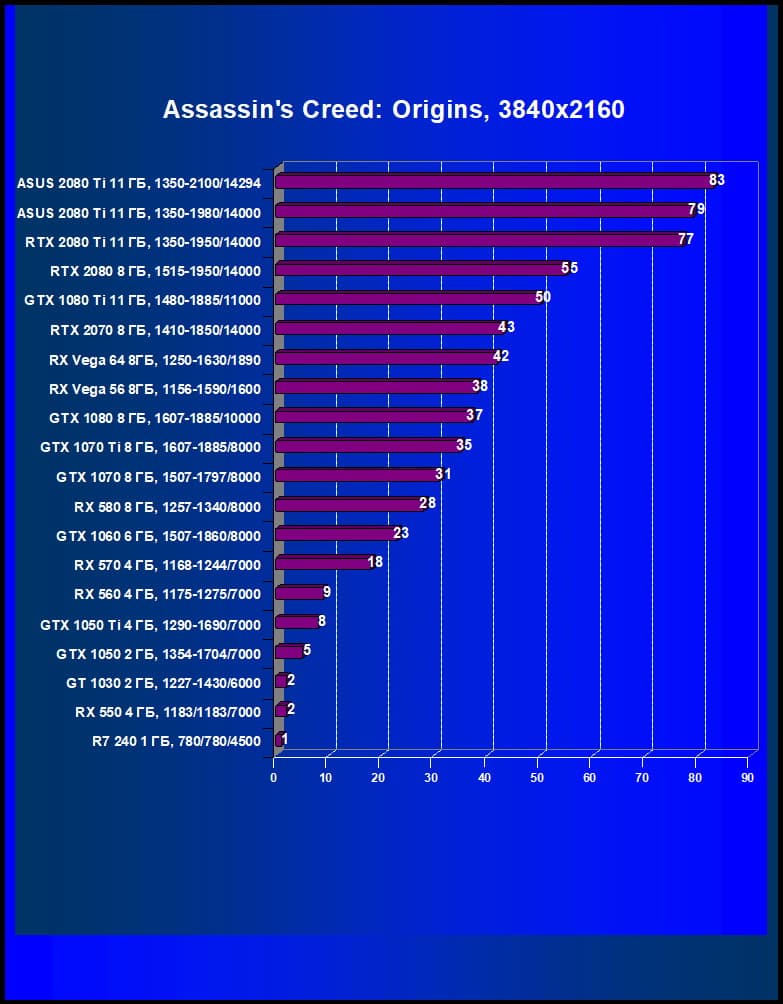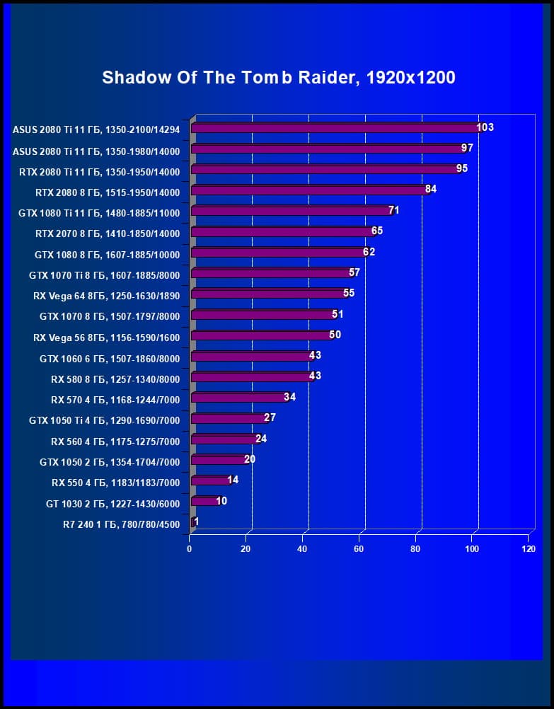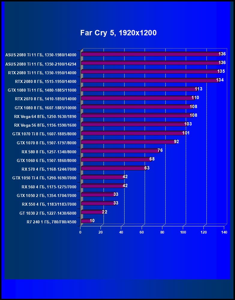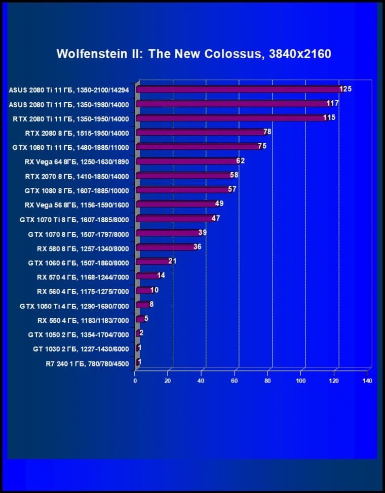 | 15 | Asus 2080 Ti 11 ГБ, 1350—2100/14294 (ручной разгон) | 615 | 5780 | 94 000 |