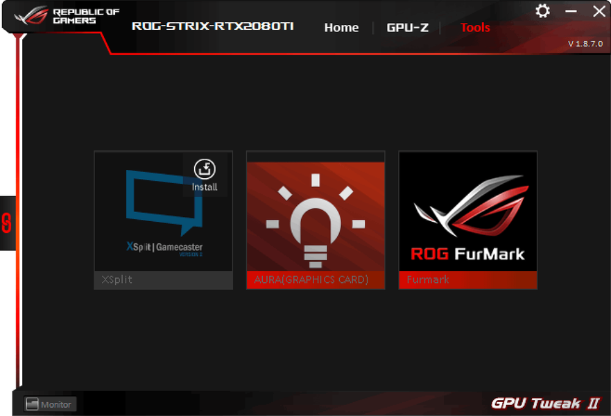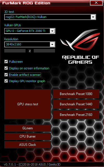 С помощью этой утилиты пользователь может не только выбрать один из предустановленных режимов с повышенными частотами работы карты, но и выставить частоту вручную, а также изменить напряжение на ядре и микросхемах памяти. Дополнительно можно управлять режимами подсветки кулера. А в качестве фирменного теста проверки на работоспособность карты (в выбранном режиме разгона) разработчики выпустили брендированный вариант FurMark (ROG Edition).