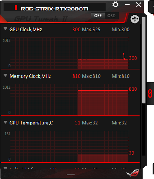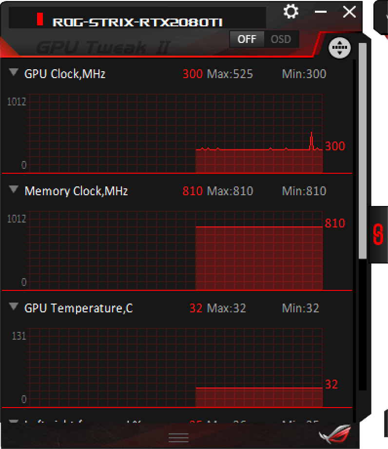 Штатная частота работы ядра в режиме OC mode повышена относительно референсных значений на 8%, однако мы специально привели значения частот у карты Nvidia Founder’s Edition. Подчеркну еще раз, что так называемой референс-карты Nvidia теперь нет, всем изданиям выдаются на тесты карты Founder’s Edition, имеющие повышенные частоты работы, они же продаются в магазинах. Поэтому не стоит удивляться, когда продукты партнеров Nvidia, выпущенные с повышенными частотами, выдают точно такую же производительность, как версии Founder’s Edition. Так вот, если сравнивать с Founder’s Edition, то карта Asus имеет частоту работы GPU всего на 1,5% выше, так что от нее можно ожидать примерно такой же производительности в режиме OC mode.