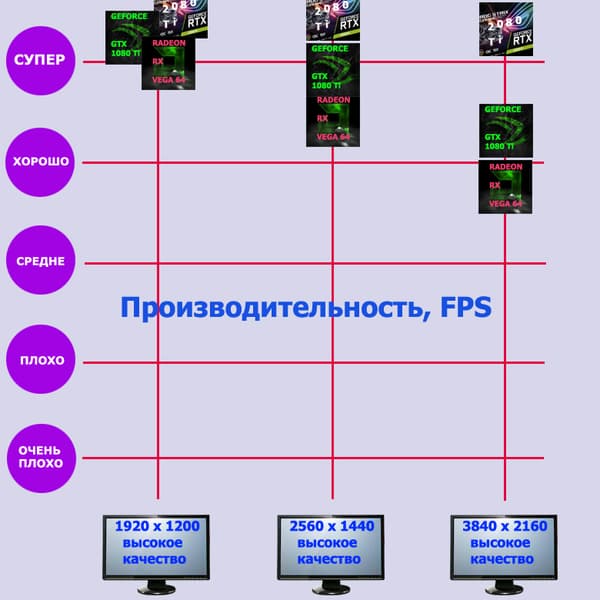 Традиционно приводим краткие результаты нашего исследования этой видеокарты: производительность, субъективно оцененная нами по шкале из пяти градаций. В качестве соперников мы взяли предыдущий флагман Nvidia — GeForce GTX 1080 Ti, и нынешний самый быстрый ускоритель AMD — Radeon RX Vega 64.