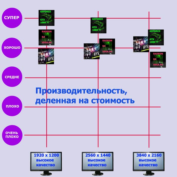 Хорошо видно, что пока RTX 2080 Ti имеет чрезмерно завышенную (даже по меркам топовых ускорителей) стоимость, и даже в целевом для этого продукта разрешении 4К привлекательность приобретения RTX 2080 Ti сомнительна. Тем не менее, тенденция очевидна: чем выше разрешение, тем выгоднее новый ускоритель премиального класса. Это хорошо объяснимо, ибо в более низких разрешениях RTX 2080 Ti подчас упирается в производительность центрального процессора (и в целом в системные ресурсы) даже на максимальных настройках графики в играх. Поэтому смысл имеет смотреть именно на разрешение 4К. Несмотря на то, что Radeon RX Vega 64 почти в 2 раза дешевле, для 4К этот ускоритель годится плохо, и дорогой RTX 2080 Ti выигрывает у него в данном рейтинге. На момент написания материала карт RTX 2080 Ti на рынке все еще маловато, цены на них едва ли снижаются. Ожидать увеличения привлекательности таких ускорителей можно лишь после Нового года, в 2019-м.