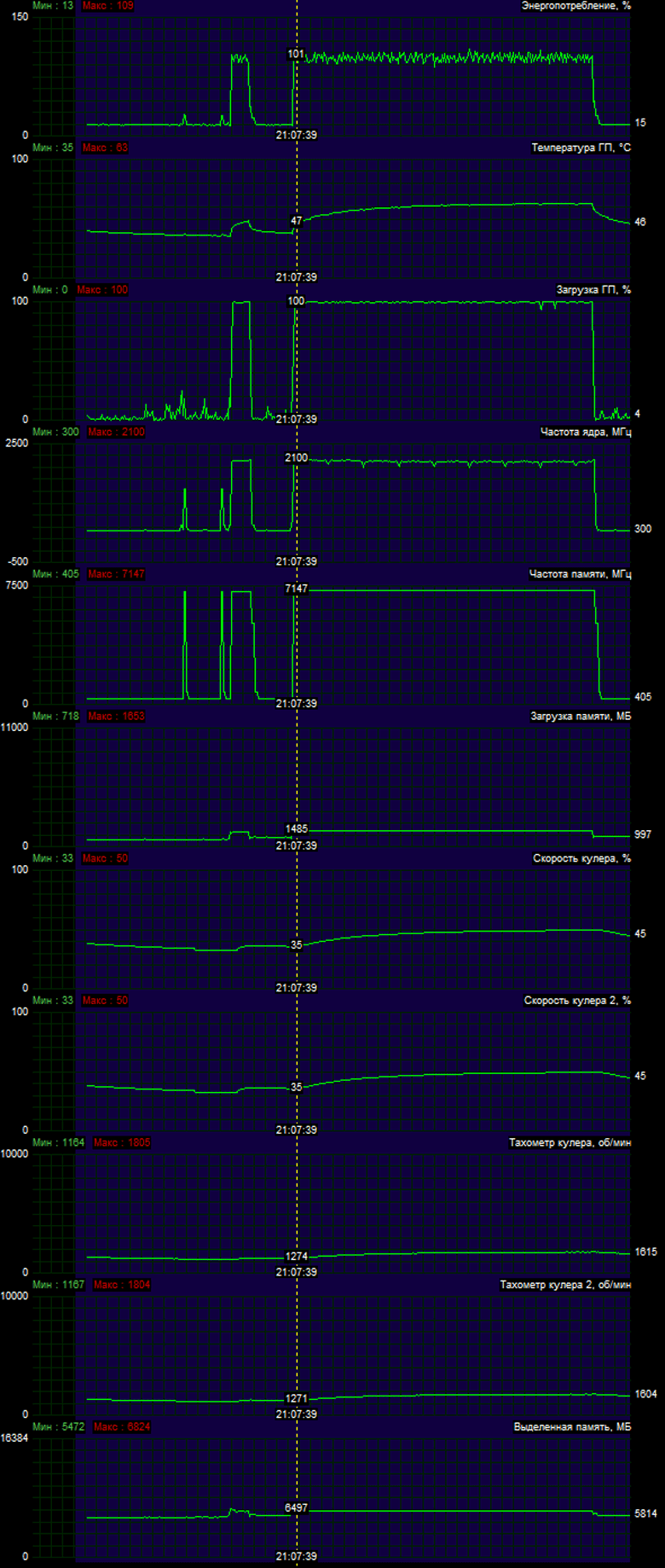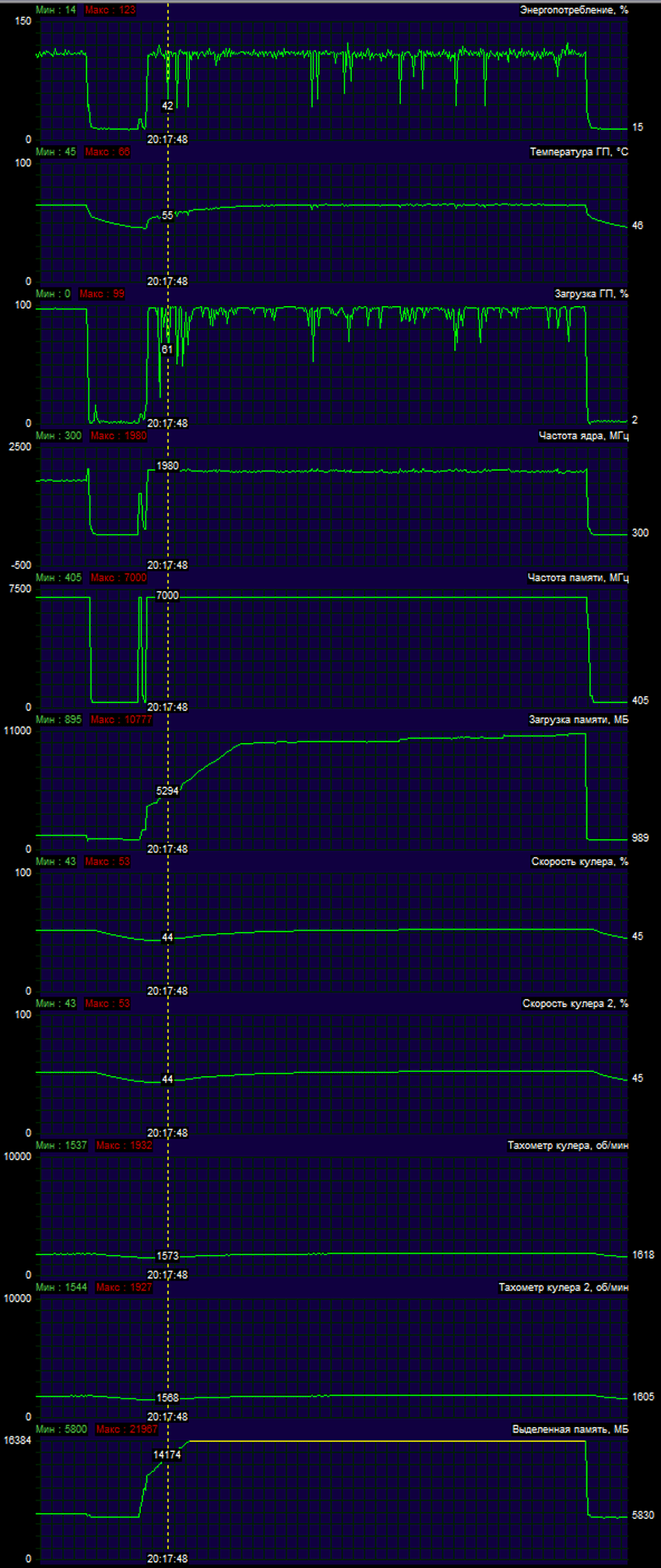 В данном случае GPU нагревался до 80 градусов при незначительном повышении уровня шума. Карта стабильно отработала несколько часов под нагрузкой на таких частотах. (Маркер на мониторинге выше выставлен на максимальную частоту GPU, а не максимум температуры GPU.)