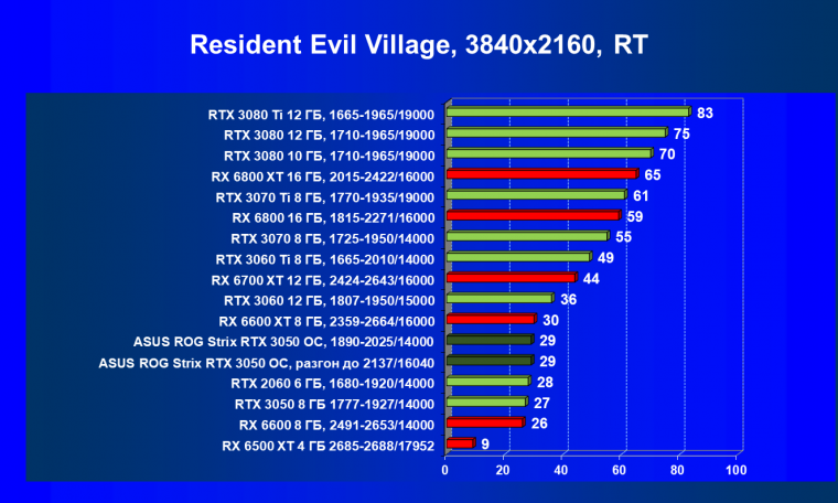 В данном случае RTX 3050 обошел не только более дорогой Radeon RX 6600, но и RX 6600 XT: даже поддержка FSR в ряде игр не помогает последнему поколению Radeon компенсировать сильное падение производительности от включения трассировки лучей. Учитывая чуть более высокие частоты работы карты Asus, логично смотрится лидерство этого продукта в своей группе.
