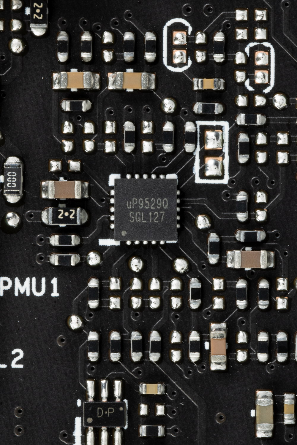 Зеленым цветом отмечена схема питания ядра, красным — памяти. Для управления схемой питания GPU используется ШИМ-контроллер uP9512R (uPI Semiconductor). Он расположен на лицевой стороне платы.