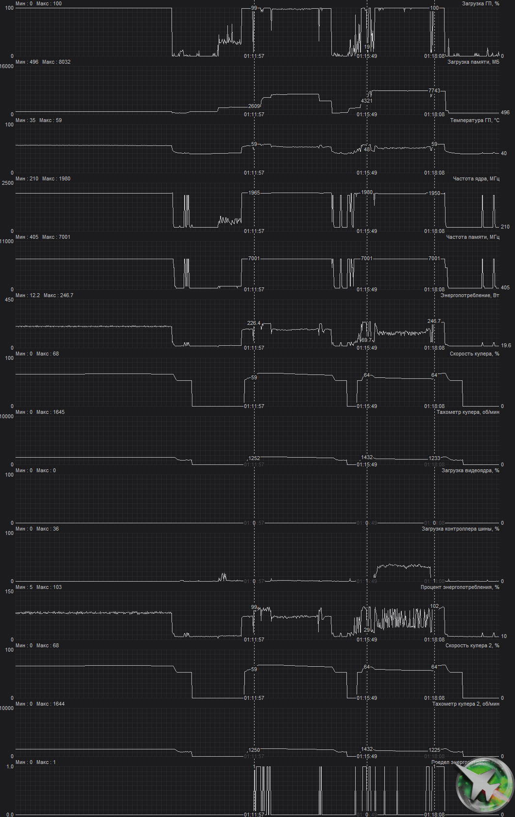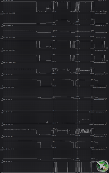 При описанном ручном разгоне параметры работы карты особо не менялись, однако максимальное потребление выросло до 254 Вт.