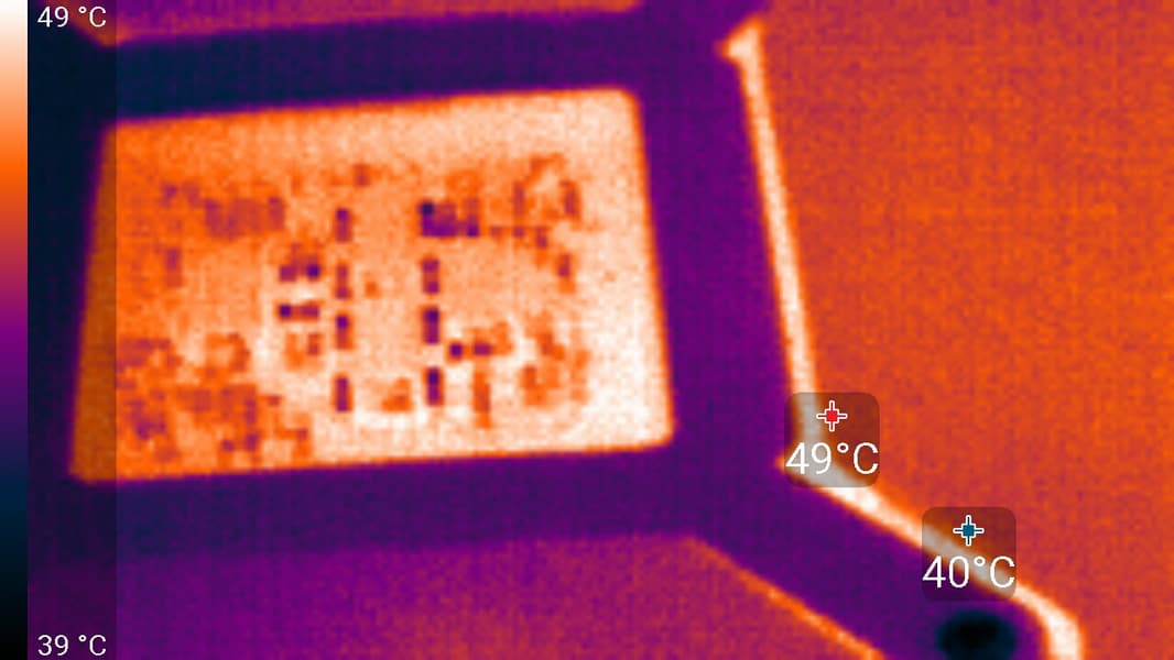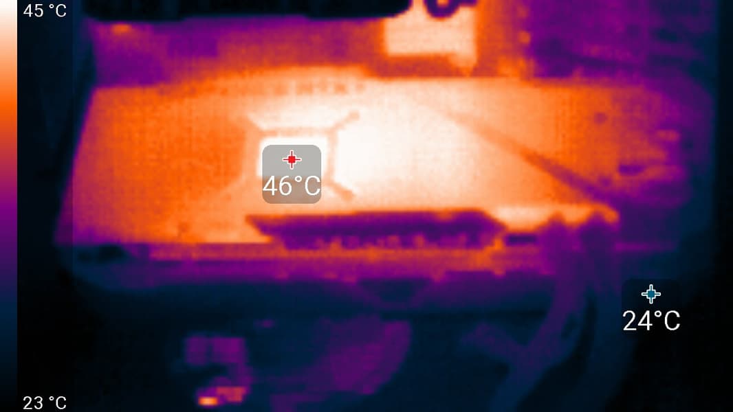 После 2-часового прогона под нагрузкой максимальная температура ядра не превысила 59 градусов, что является отличным результатом для видеокарт такого уровня. Максимальная мощность была зафиксирована на уровне 247 Вт, а максимальный нагрев наблюдался в центре PCB, и основным источником нагрева являются преобразователи питания.