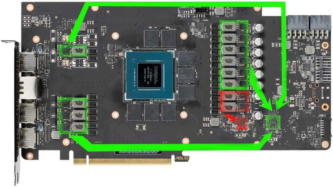 Суммарное количество фаз питания у Nvidia GeForce RTX 3060 Ti Founders Edition — 10: 8 фаз на ядро и 2 на микросхемы памяти. У карты Asus в сумме 12 фаз: 2 на память и 10 на GPU.