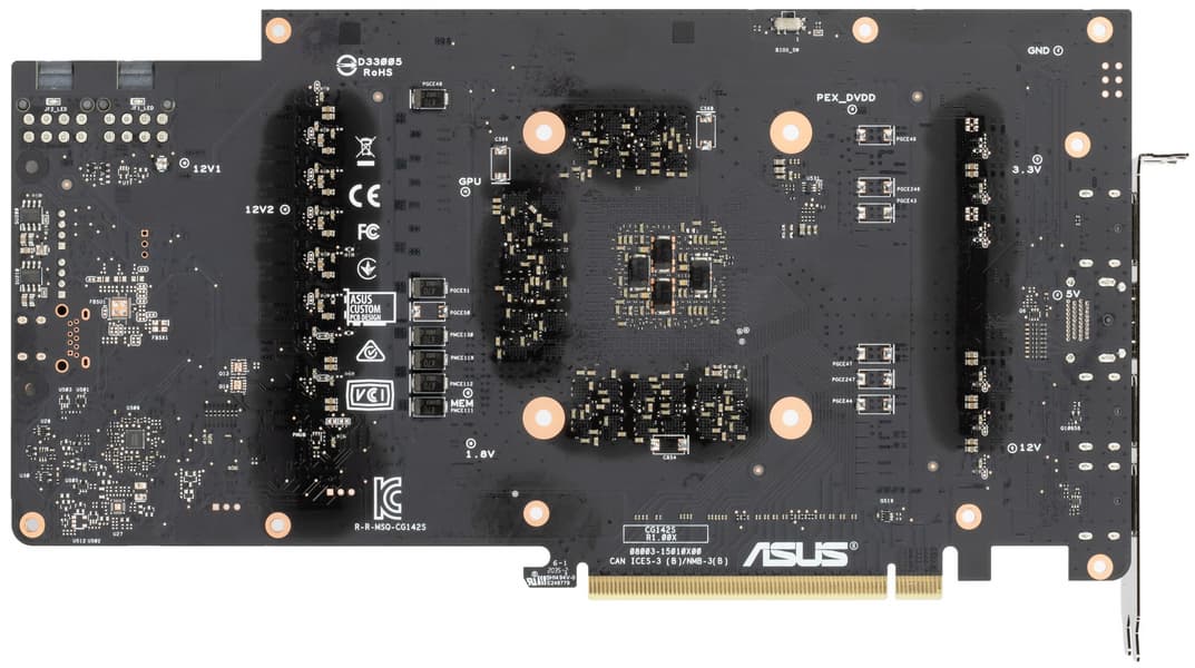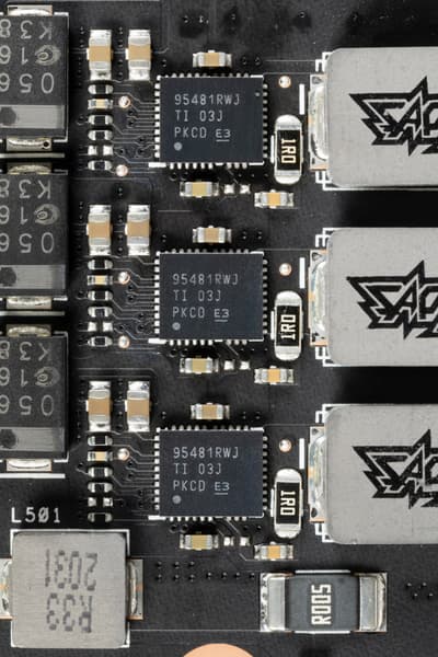 Схема питания ядра у карты Asus традиционно построена с применением технологии Super Alloy Power II, использованы современные твердотельные конденсаторы и транзисторные сборки DrMOS — в данном случае CSD95481RWJ (Texas Instruments), каждая из которых рассчитана максимально на 60 А.