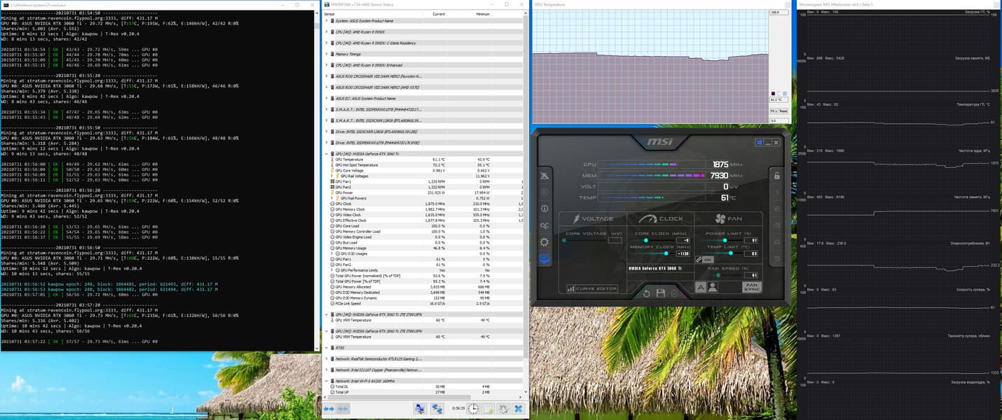А вот оптимизация алгоритма kawpow (RVN) здесь мало что дает, ибо сильное понижение PL приводит к падению хэшрейта (а в случае с ethash сильно спасало именно снижение PL, ибо хэшрейт оставался таким же при гораздо меньшем потреблении).