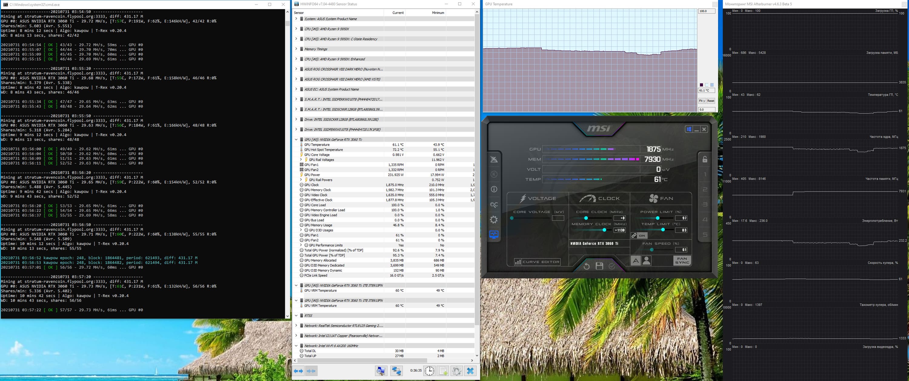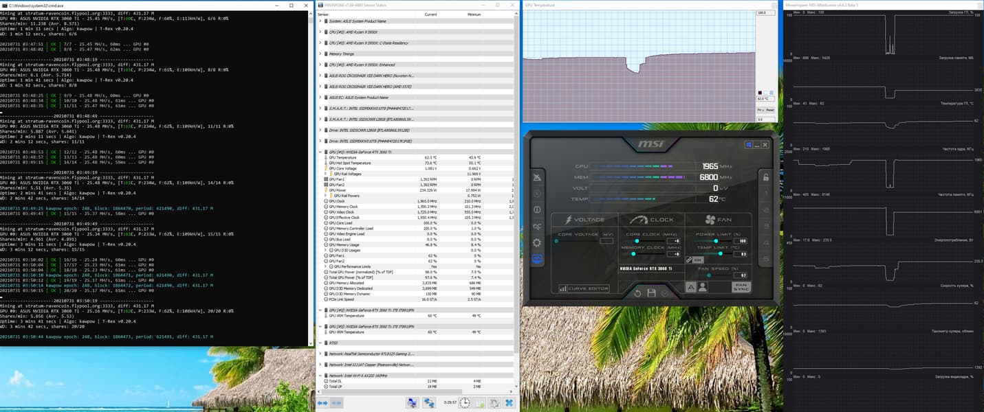 В майнинге RVN расклад сил точно такой же (GeForce RTX 3060 Ti находится между Radeon RX 6800 и GeForce RTX 2080 Ti). Алгоритм kawpow более энергозатратный, чем ethash, поэтому нагрев выше, чем в предыдущем случае.
