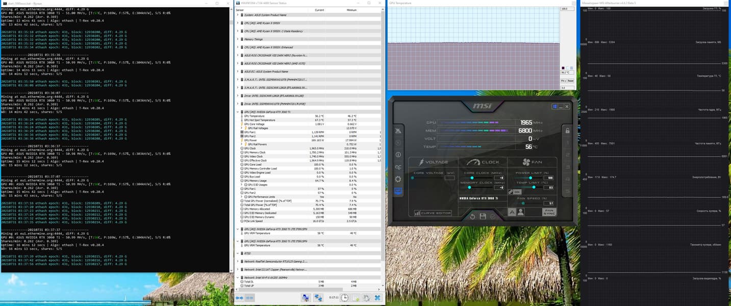 - оптимизация (лимит потребления снижен до 70%, частота GPU снижена на 200 МГц, частота памяти повышена на 500—1000 МГц (в зависимости от карты), вентиляторы выставлены в ручном режиме на 80%)