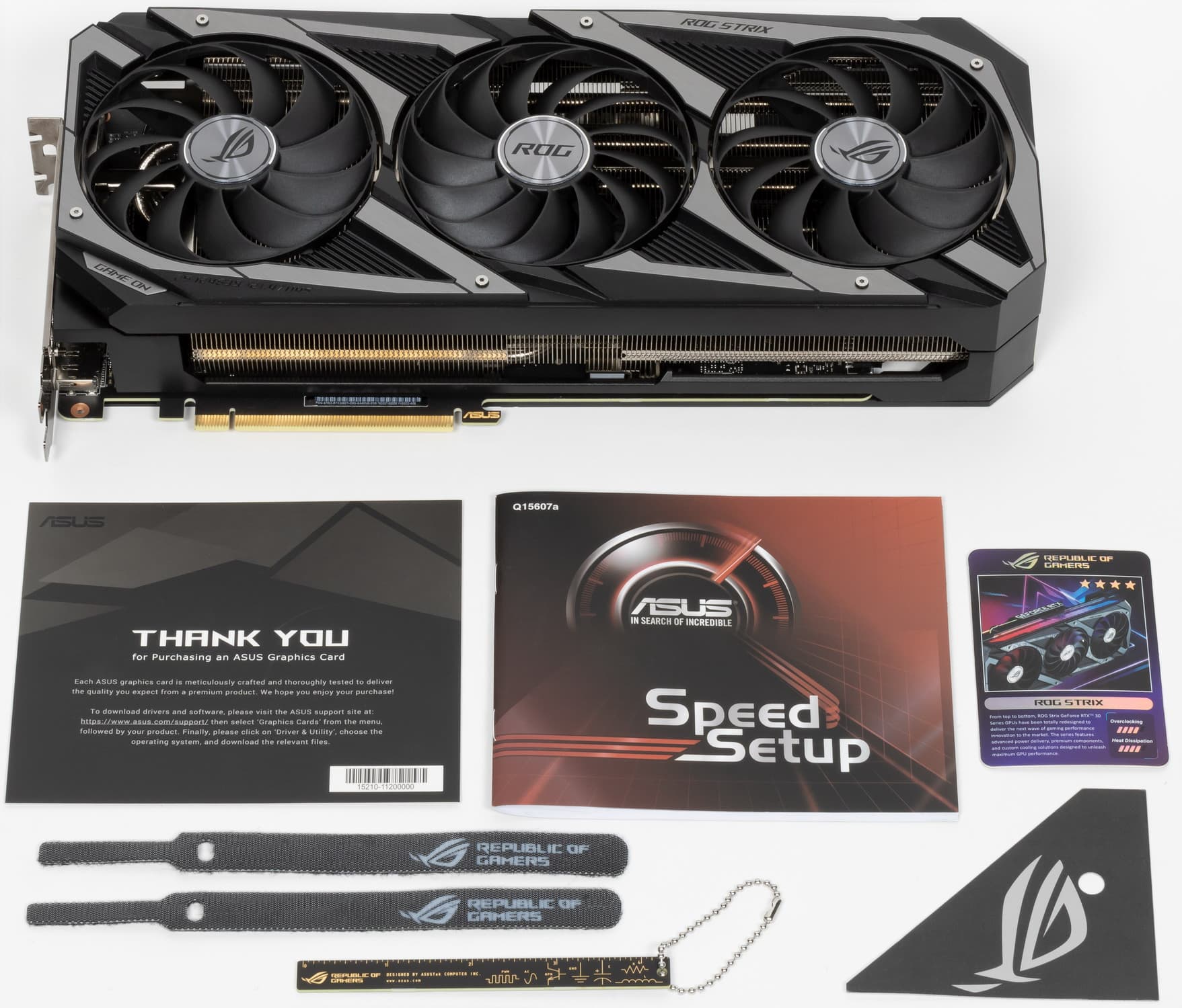 Комплект поставки, кроме традиционного руководства пользователя и карточки ROG, включает мелкие бонусы в виде стяжек и фирменной линейки.