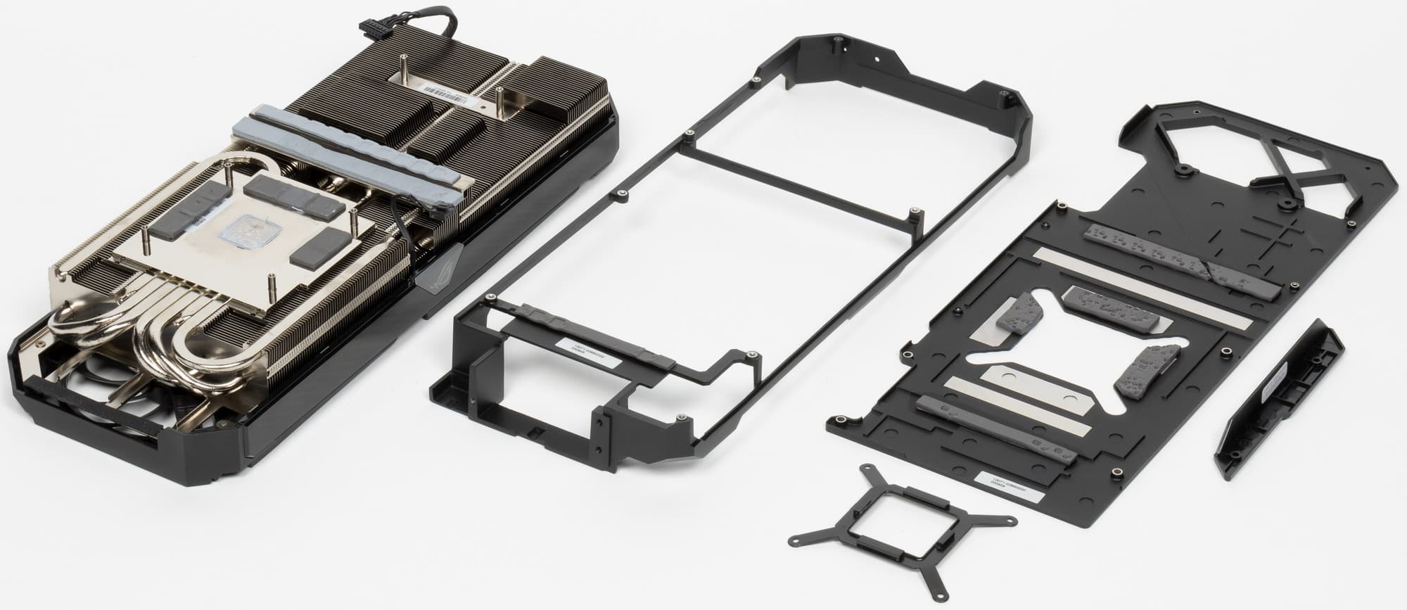 Основой СО является огромный двухсекционный пластинчатый никелированный радиатор с тепловыми трубками, припаянными к подошве прямого контакта с GPU и микросхемами памяти. Этот же радиатор служит охладителем и для компонентов преобразователей питания VRM с помощью небольших подошв. Для остальных мосфетов VRM предусмотрен отдельный радиатор, размещенный на раме, прикрученной к основному радиатору. Задняя пластина выполнена из алюминия с электрозащитным покрытием и имеет двойное предназначение: служит элементом защиты PCB и через термоинтерфейс участвует в охлаждении PCB в районе микросхем памяти и преобразователей питания.