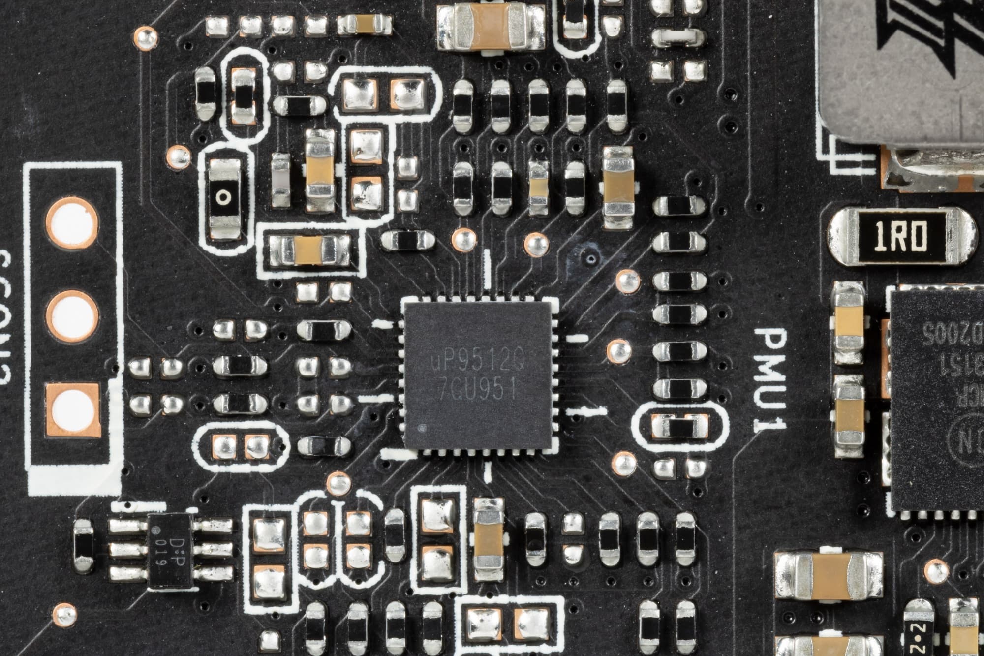 На лицевой стороне имеется еще один ШИМ-контроллер uPI uP9512Q, который управляет 2-фазной схемой питания микросхем памяти.