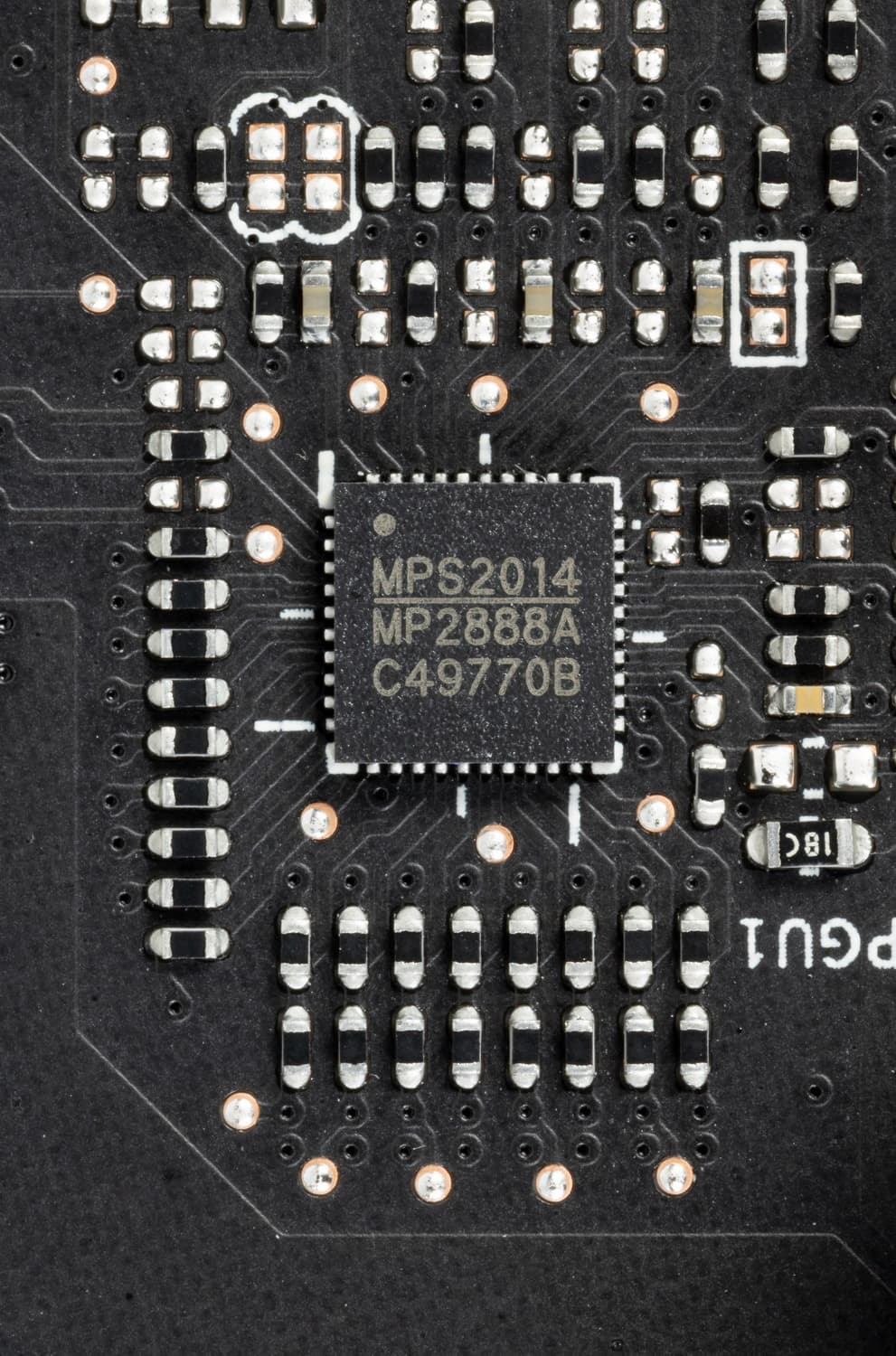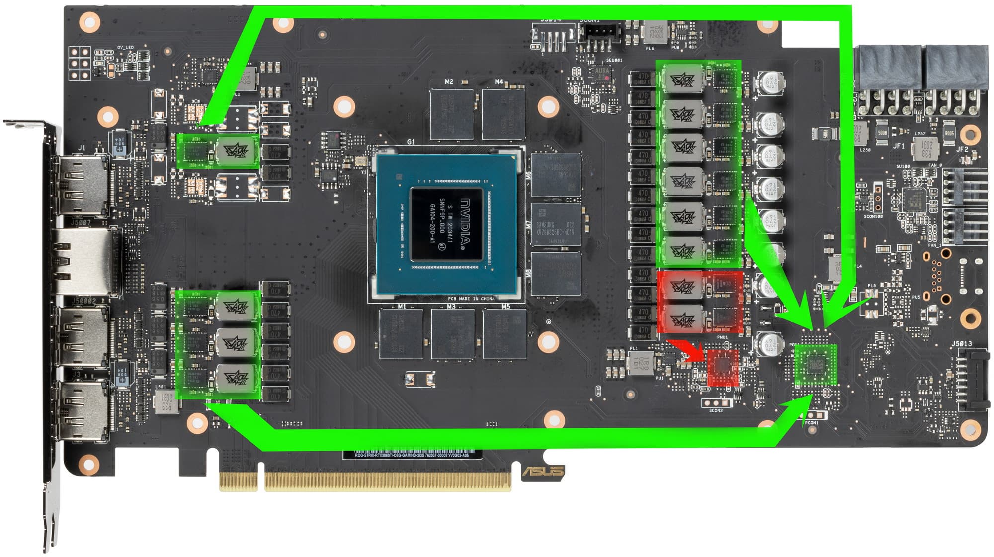 Зеленым цветом отмечена схема питания ядра, красным — памяти. Для управления схемой питания GPU используется ШИМ-контроллер MP2888A (Monolithic Power Systems), рассчитанный максимально на 10 фаз. Он расположен на лицевой стороне платы.