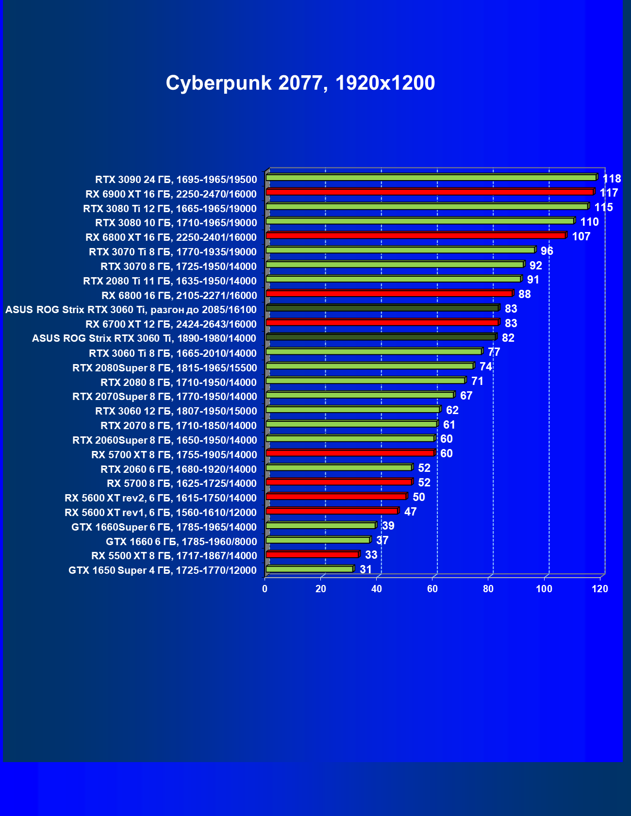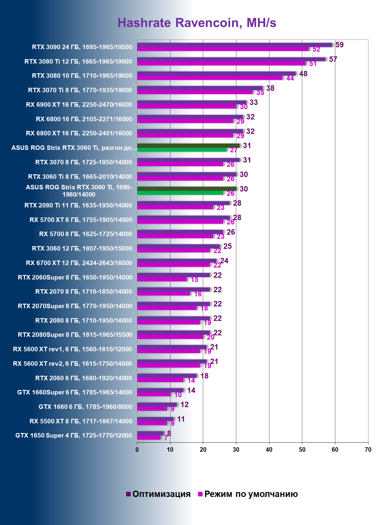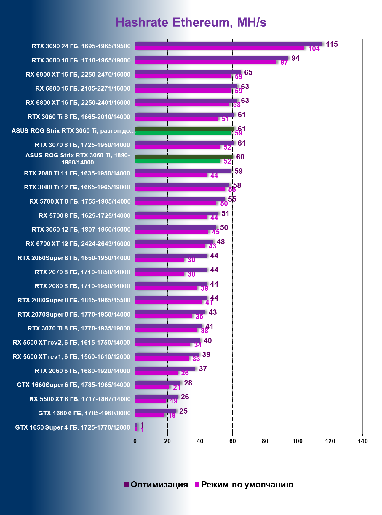 | 04 | Asus ROG Strix RTX 3060 Ti, 1890—1980/14000 | 50 | 367 | 74 000 |
