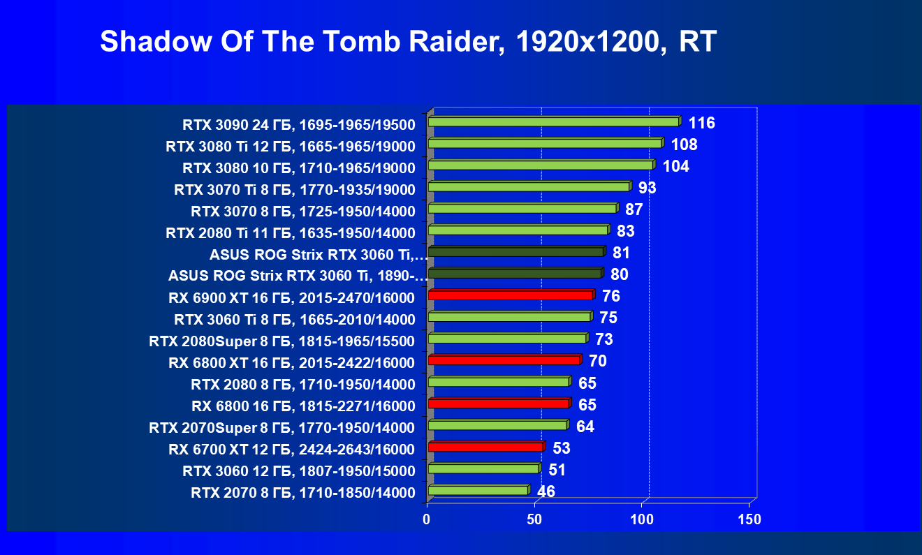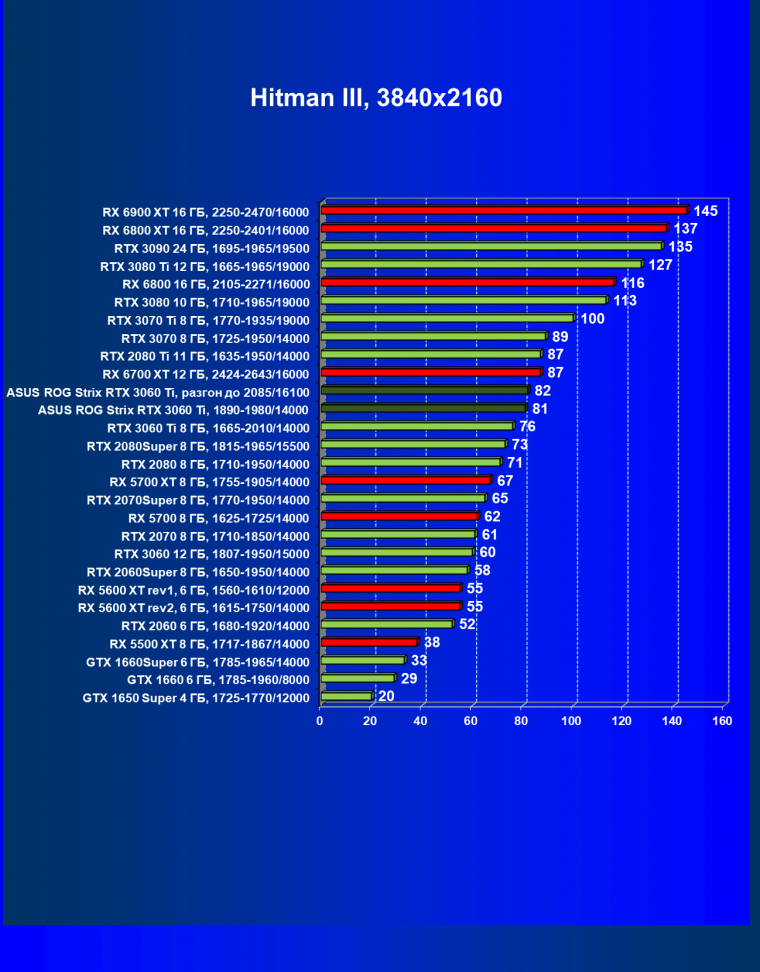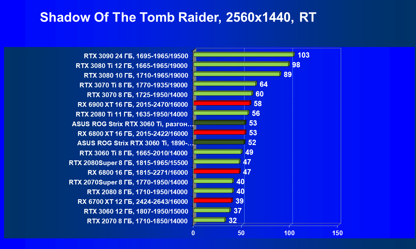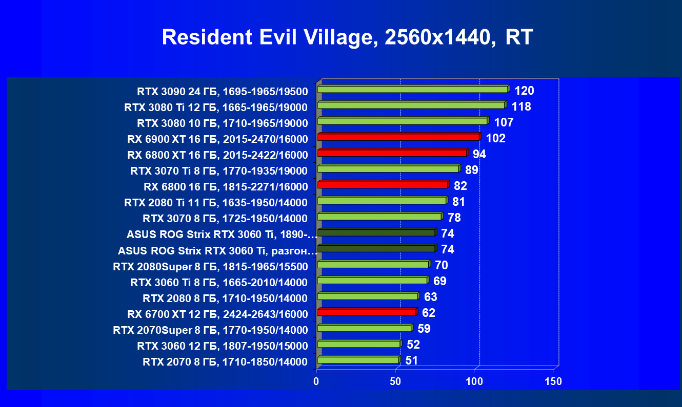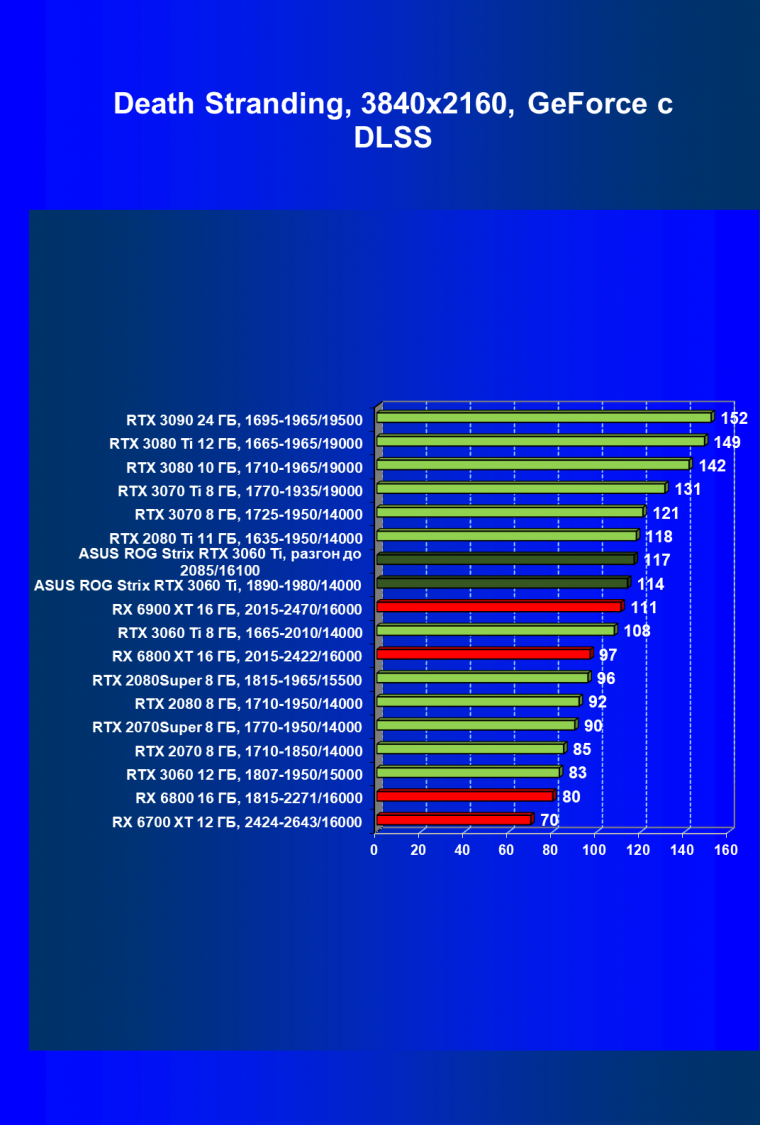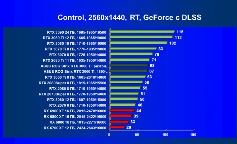 Опять же, из-за своей «ахиллесовой пяты» видеокарта Radeon RX 6700 XT отправилась на последнее место в группе, а Asus ROG Strix GeForce RTX 3060 Ti лидирует.