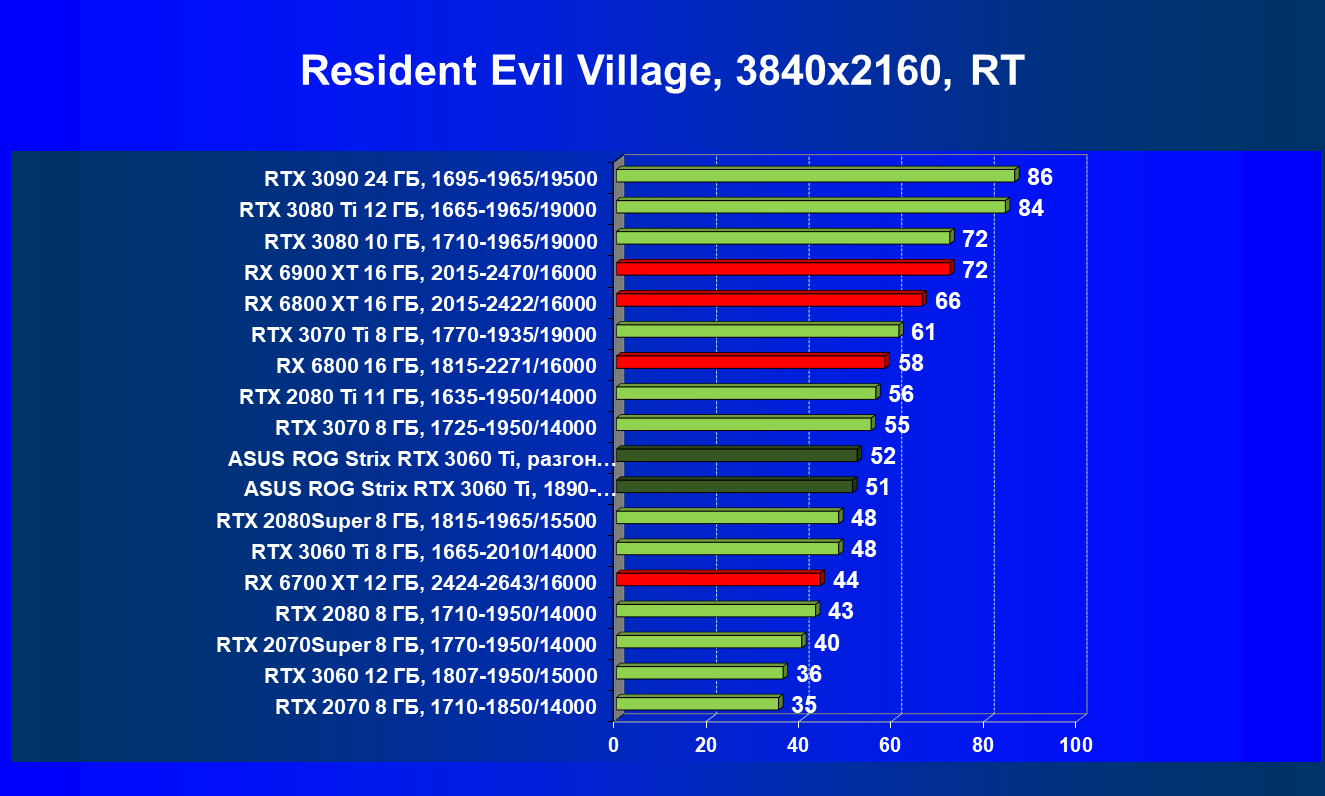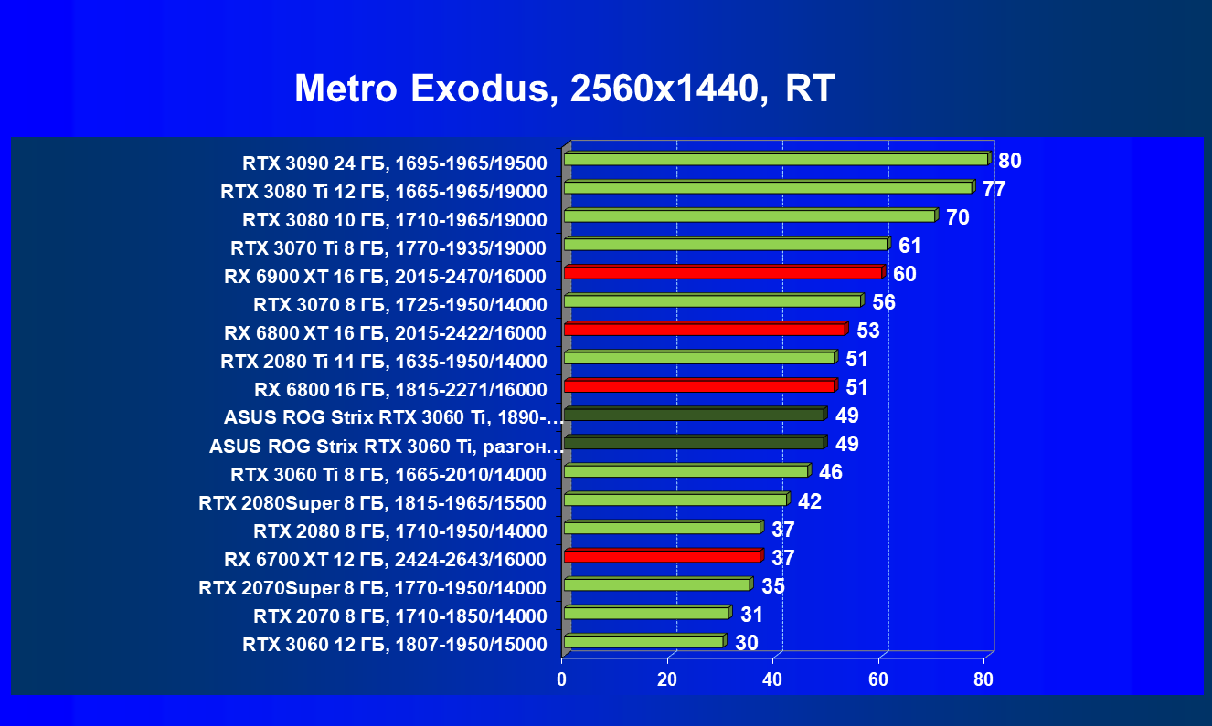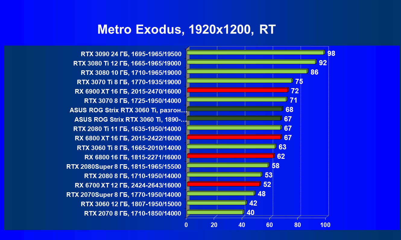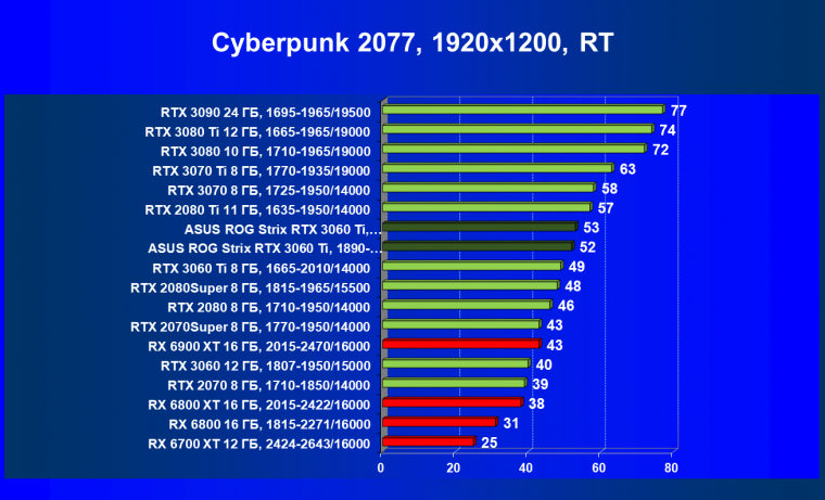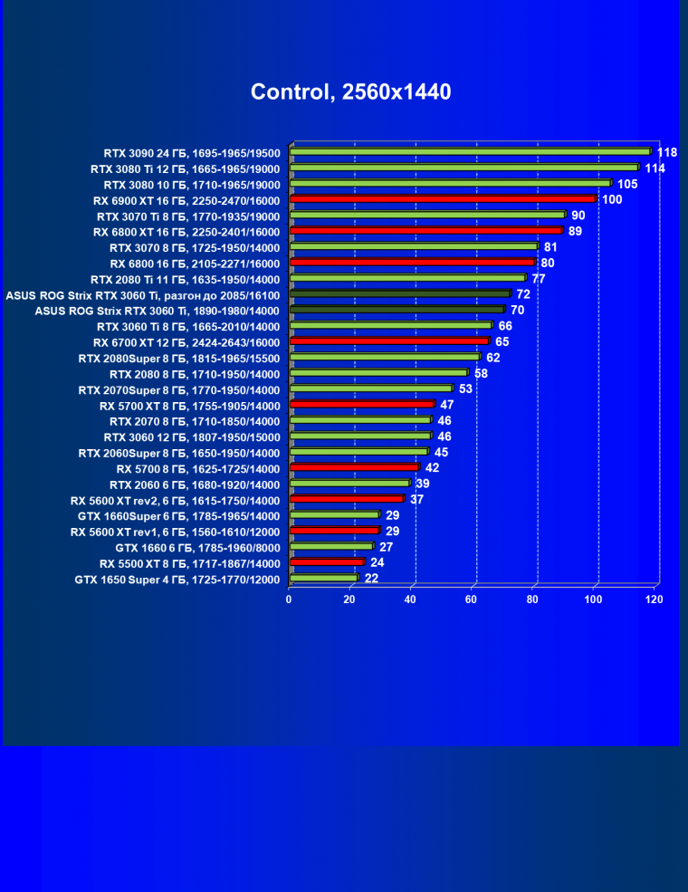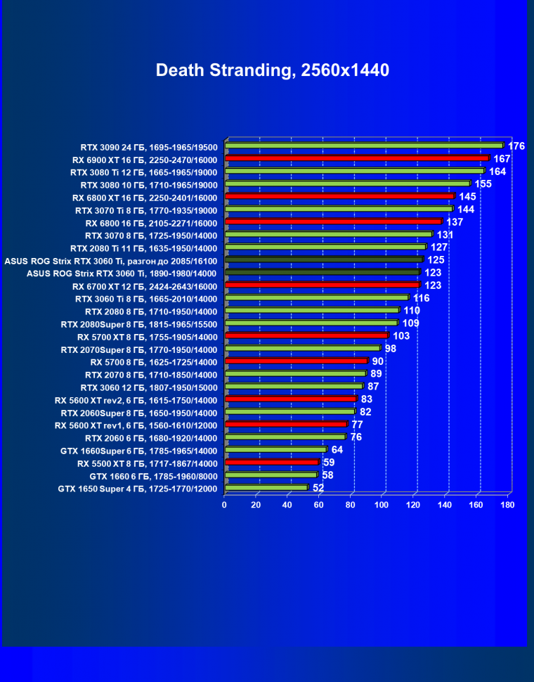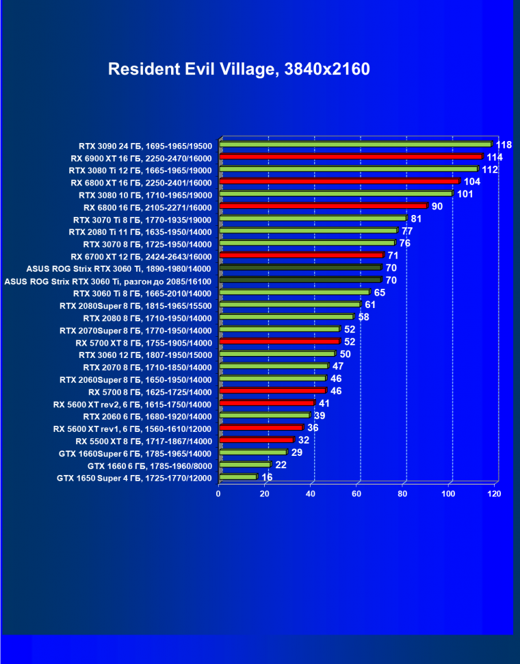 Опять же, из-за своей «ахиллесовой пяты» видеокарта Radeon RX 6700 XT отправилась на последнее место в группе, а Asus ROG Strix GeForce RTX 3060 Ti лидирует.