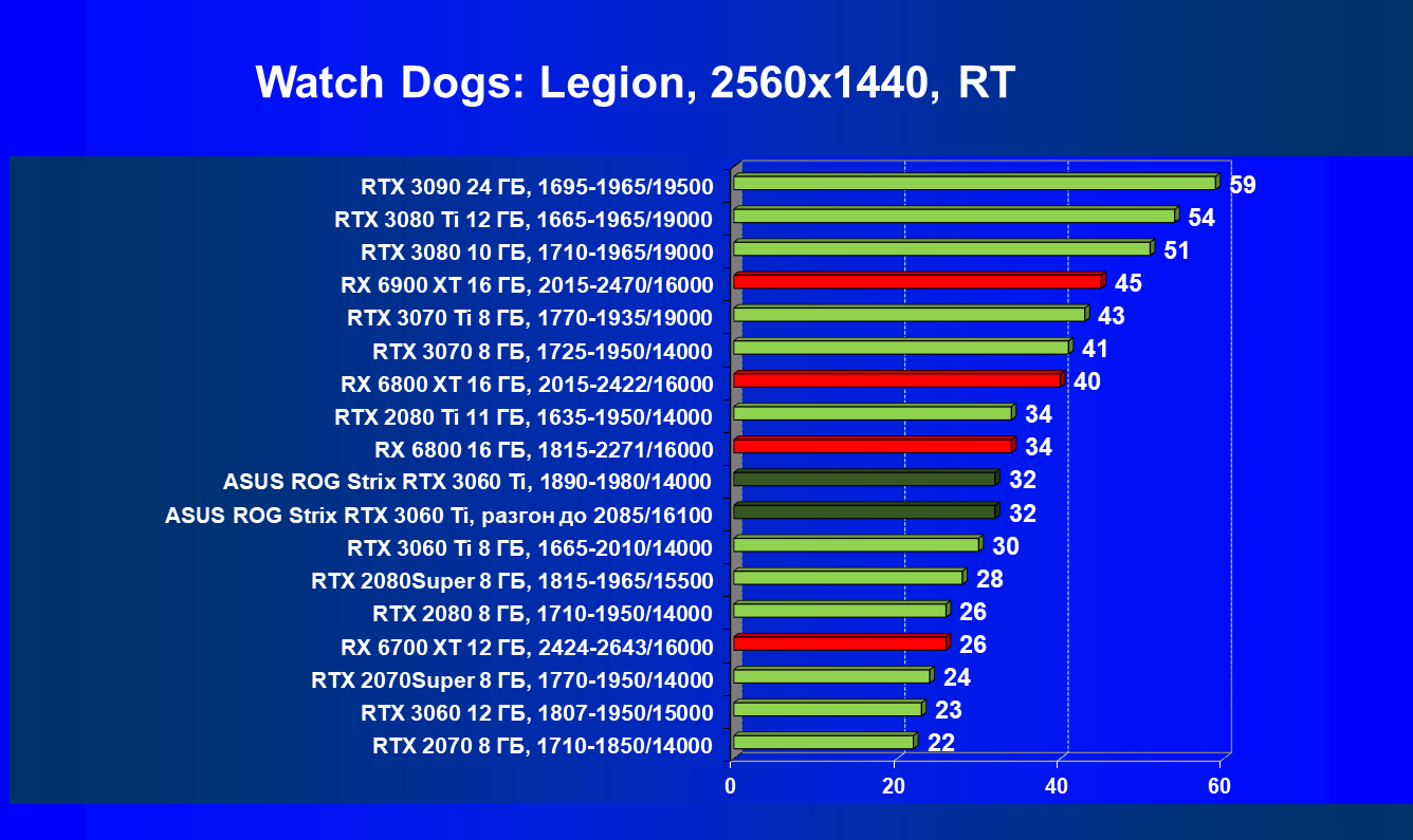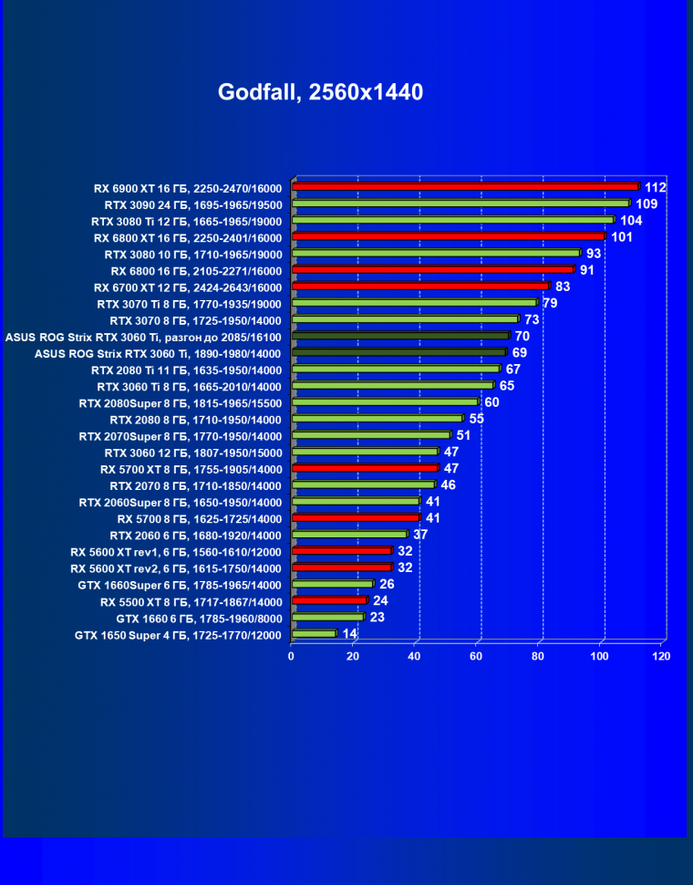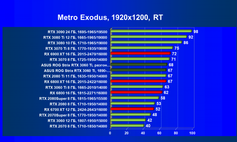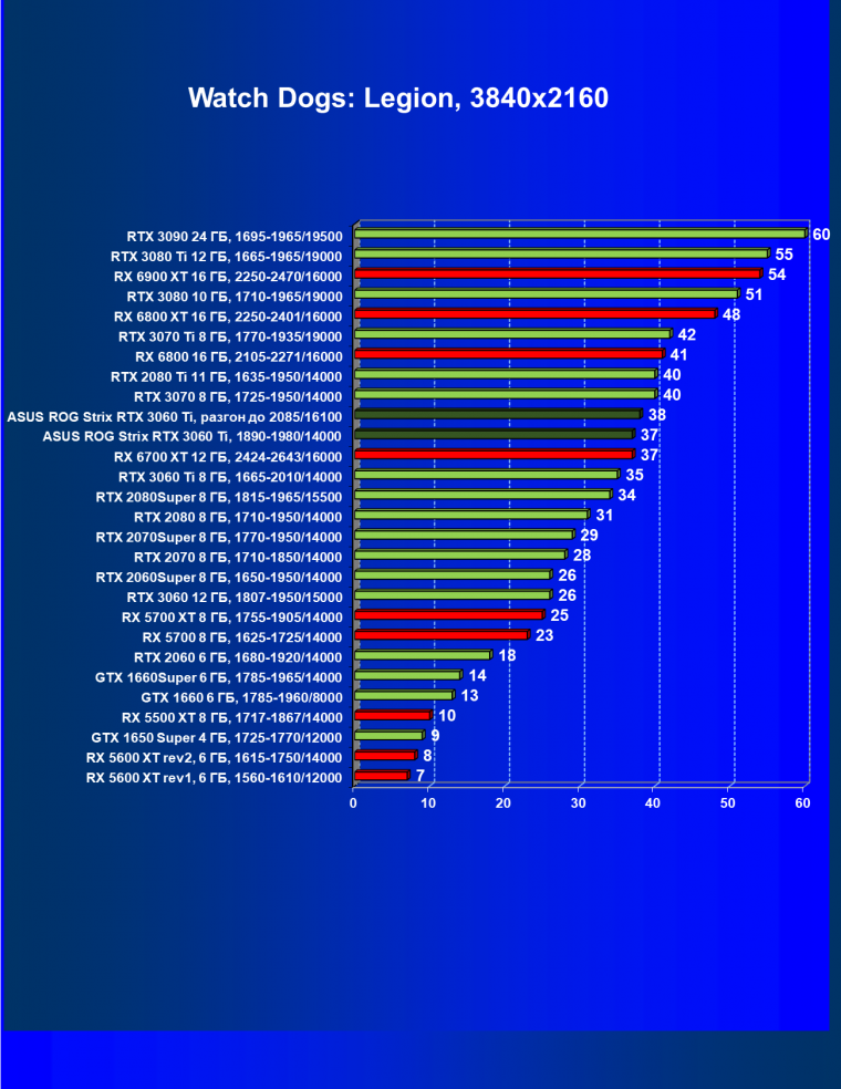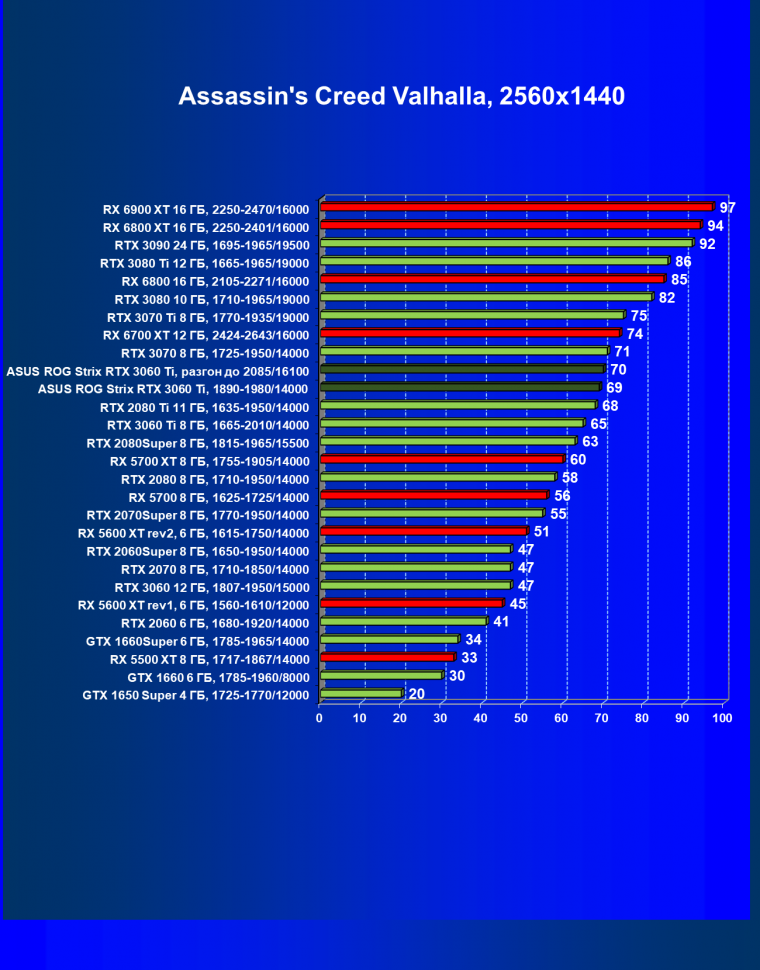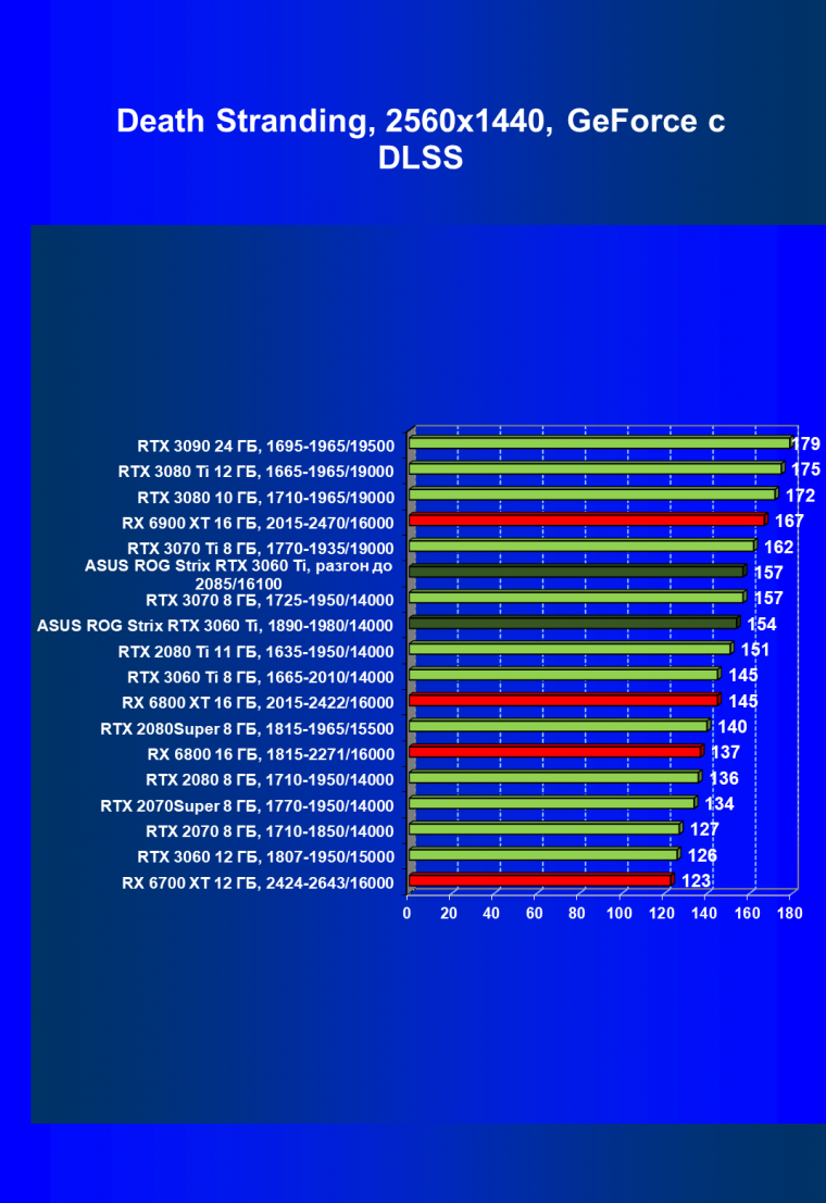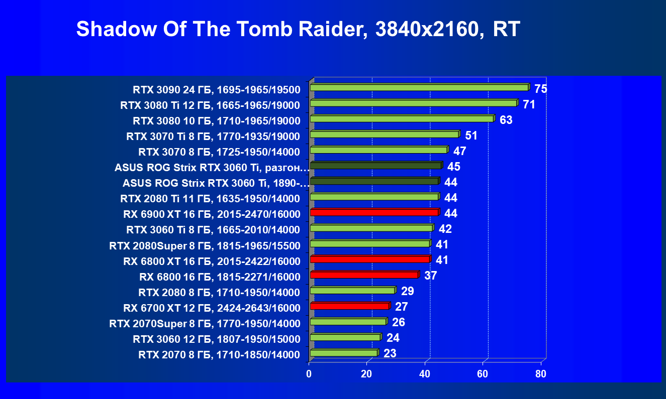 Опять же, из-за своей «ахиллесовой пяты» видеокарта Radeon RX 6700 XT отправилась на последнее место в группе, а Asus ROG Strix GeForce RTX 3060 Ti лидирует.