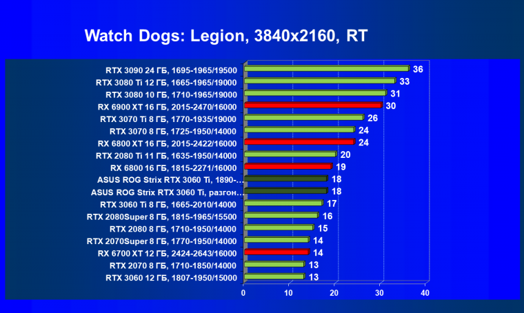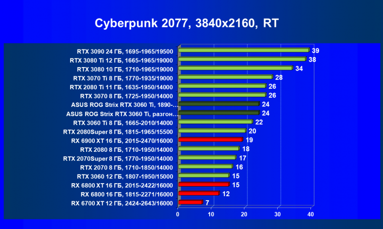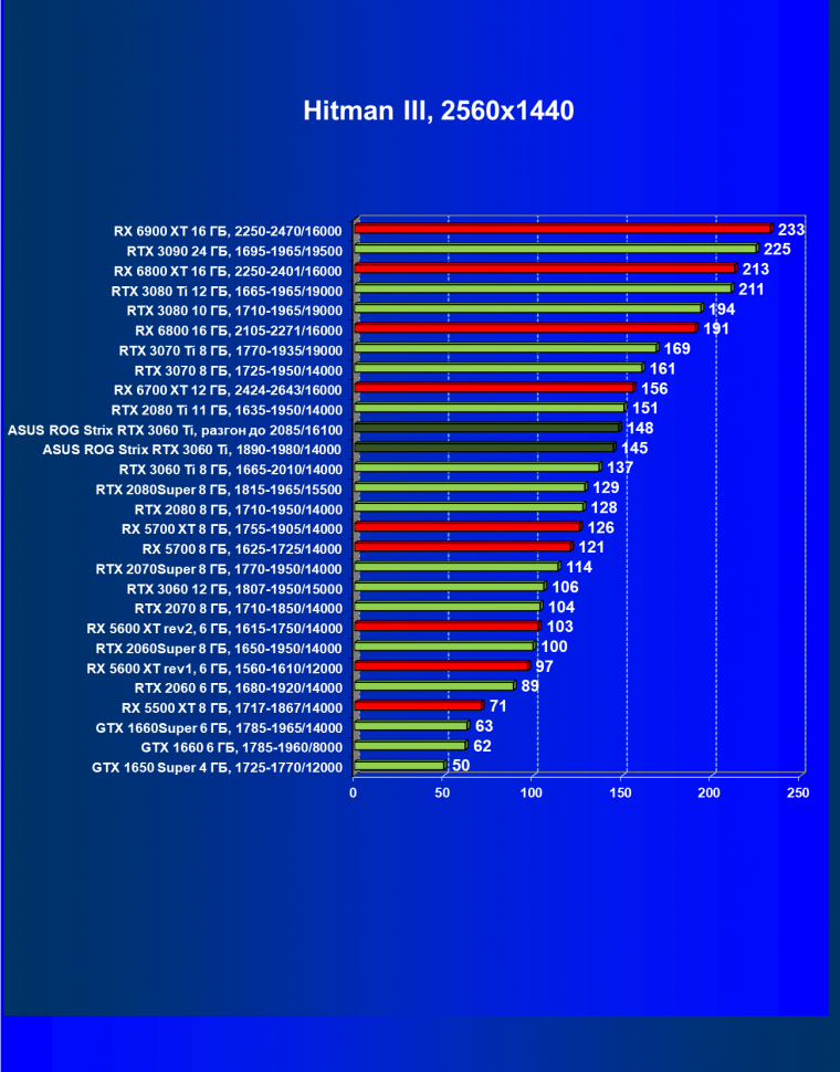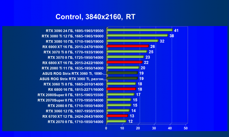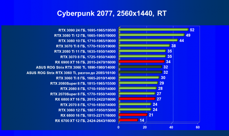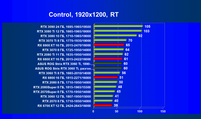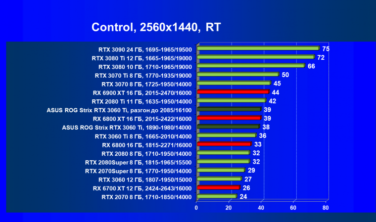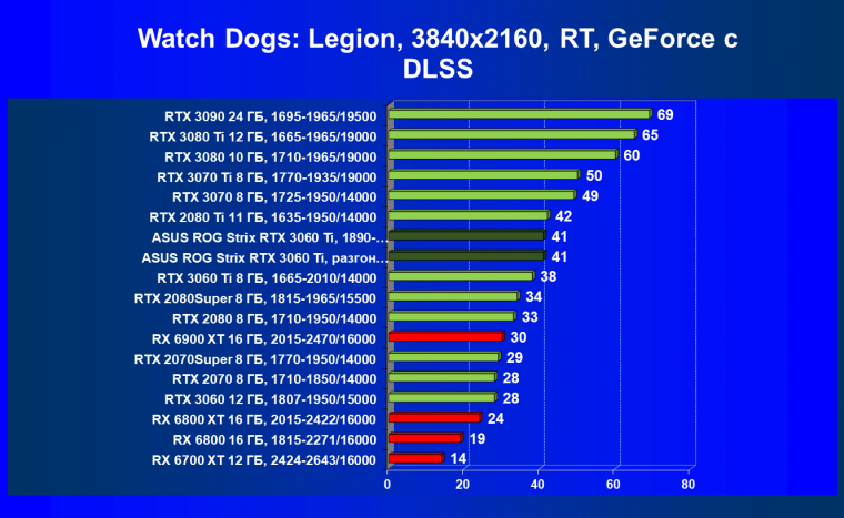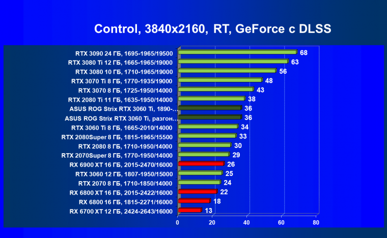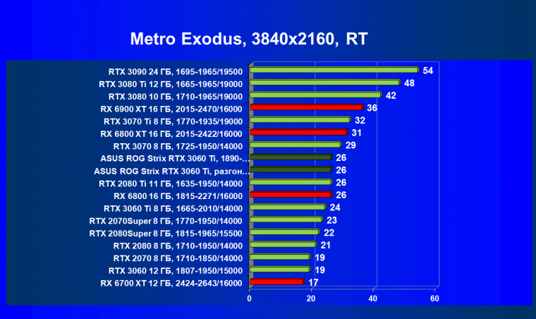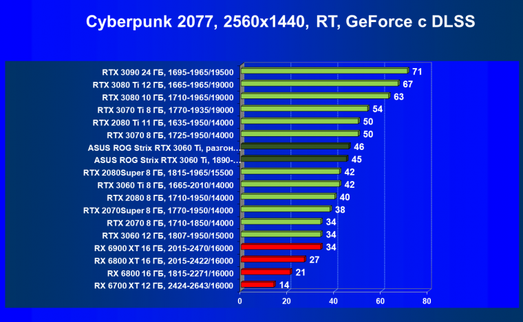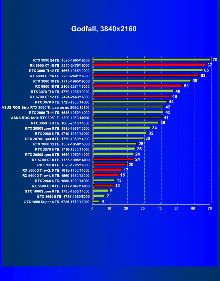 Опять же, из-за своей «ахиллесовой пяты» видеокарта Radeon RX 6700 XT отправилась на последнее место в группе, а Asus ROG Strix GeForce RTX 3060 Ti лидирует.