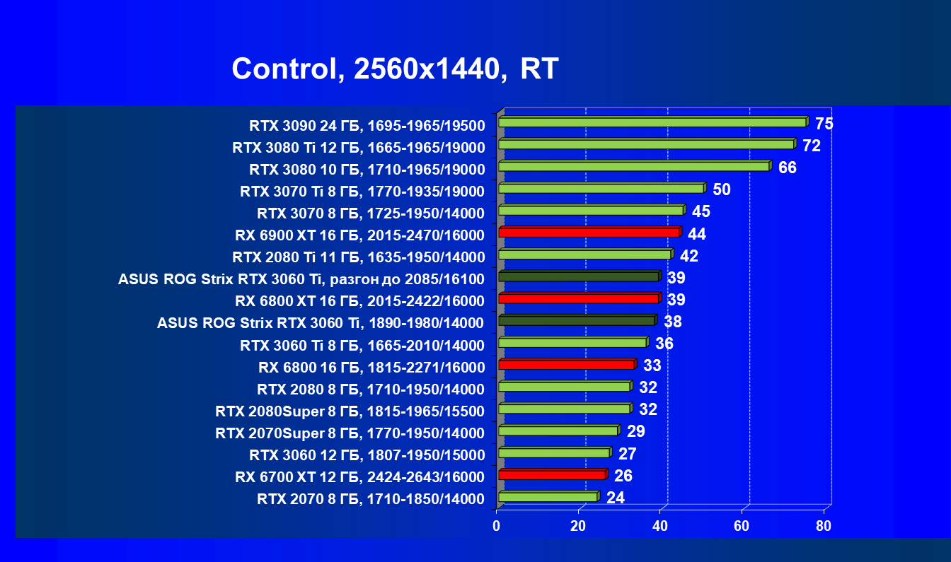 В целом GeForce RTX 3060 Ti обходит топовые решения предыдущего поколения в лице GeForce RTX 2080/Super, не говоря уже о GeForce RTX 2070 Super и Radeon RX 5700 XT. Однако у GeForce RTX 3060 Ti есть очень серьезный и более быстрый конкурент в лице Radeon RX 6700 XT. Карта Asus несильно отличается по частоте ядра от референс-карты, разница в производительности у них скромная, и лишь при ручном разгоне отличие становится заметным.