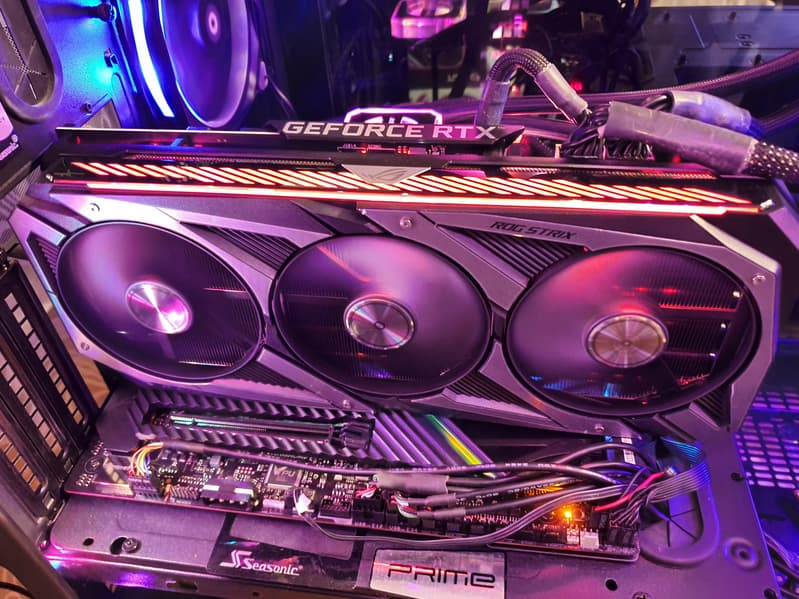 Подсветка у карты реализована на верхнем торце, во вставках около вентиляторов и в логотипе ROG, встроенном в заднюю пластину.