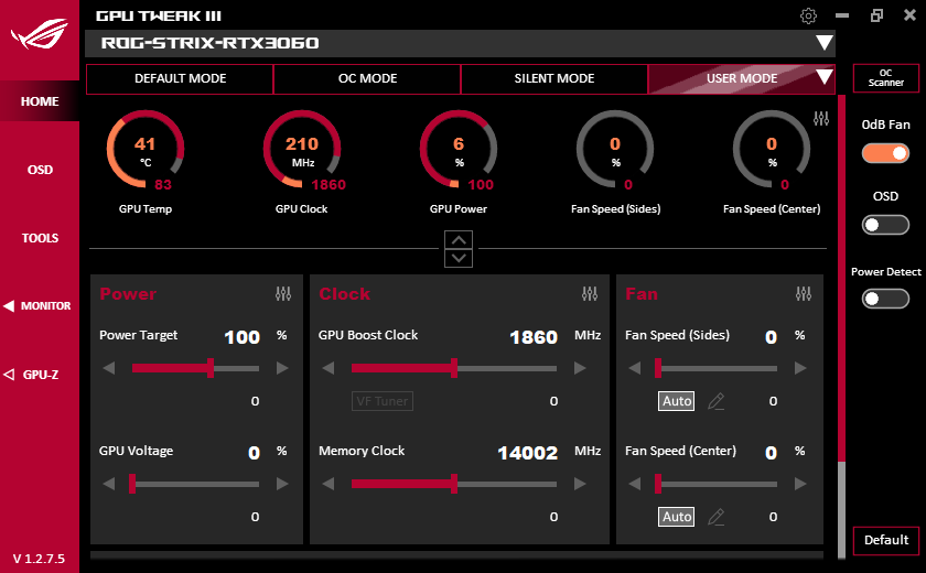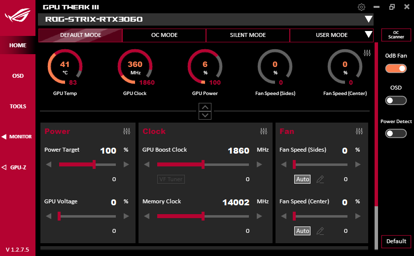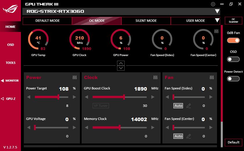 Питание подается через два 8-контактных разъема. Фирменная утилита Asus GPU Tweak в своей новой версии III прекрасно работает с этой картой, однако почему-то обозначает ее как 3060, а не 3060 Ti. Тем не менее, именно через GPU Tweak можно включить фабричный режим OC Mode. Разумеется, есть и возможность ручного разгона.