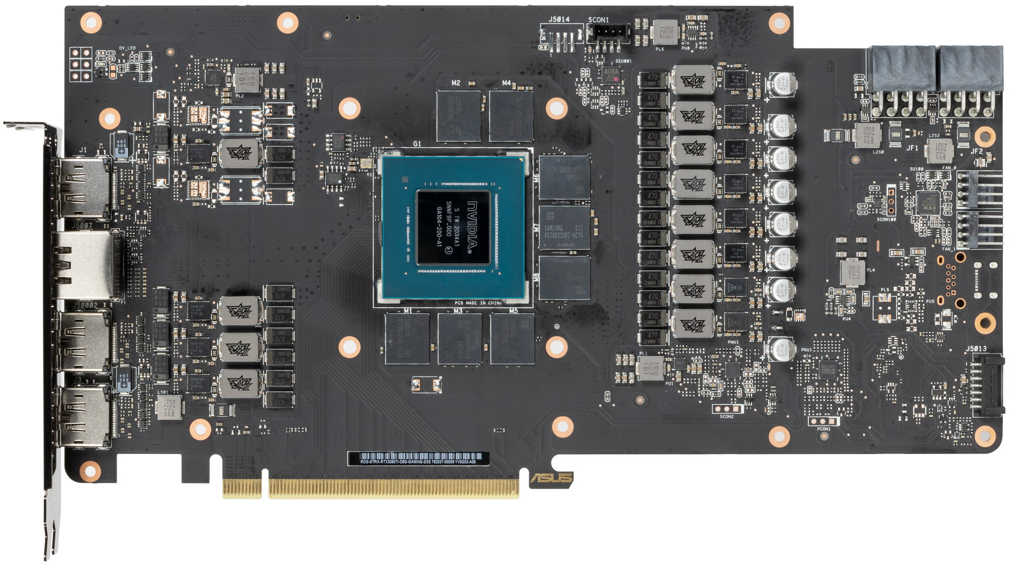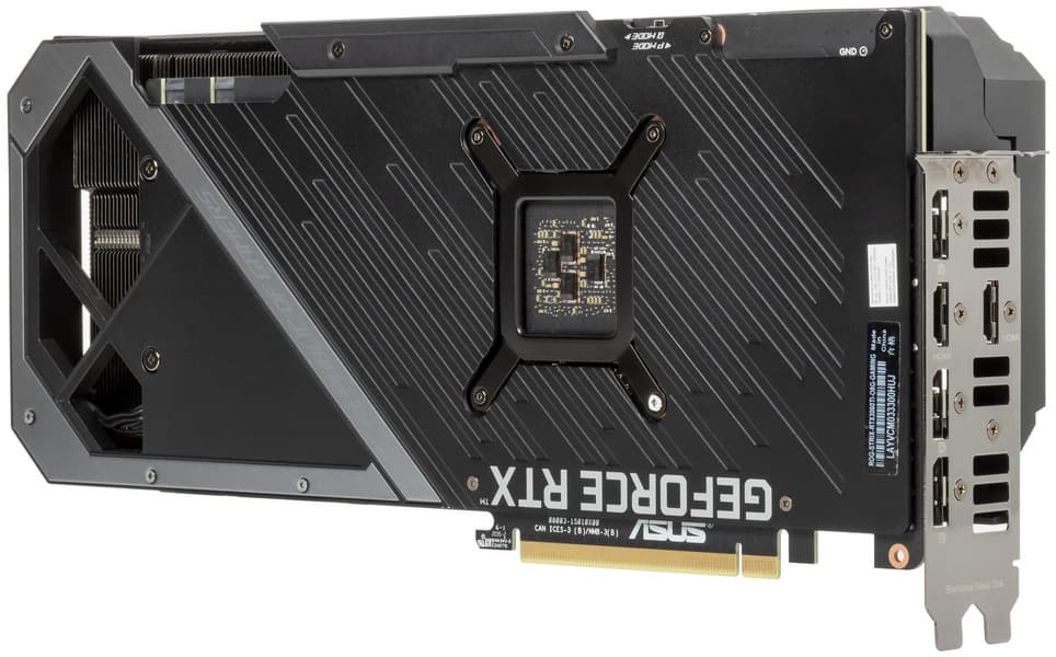 Новая концепция охлаждения, предложенная Nvidia, предусматривает наличие радиатора, который заметно длиннее самой PCB, при этом крайний правый вентилятор СО продувает ребра и тепловые трубки радиатора насквозь. Карта Asus почти полностью следует этой концепции, однако печатная плата у нее огромная, а следовательно вместе с СО эта карта будет смотреться настоящим монстром. Да, взяв эту видеокарту в руки, трудно поверить, что это не GeForce RTX 3090 и не GeForce RTX 3080, а всего лишь GeForce RTX 3060 Ti.