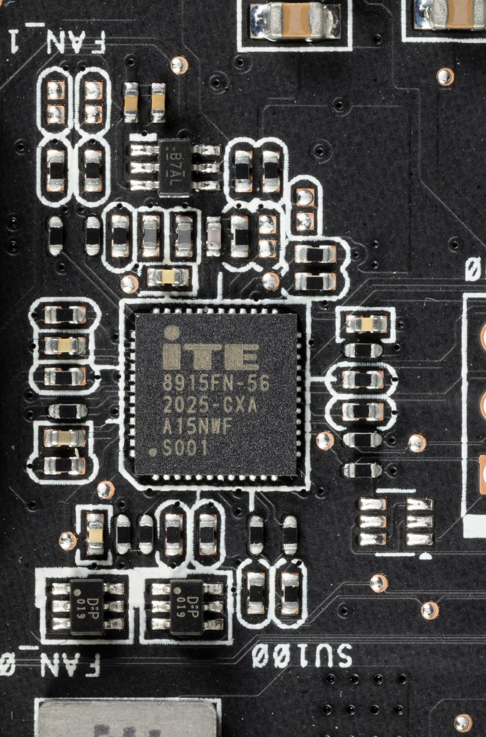 Как и у всей серии видеокарт ROG, у этой платы в хвостовой части имеются два коннектора для подключения корпусных вентиляторов, которые будут работать в соответствии с нагревом видеокарты, за это отвечает контроллер IT8915FN (ITE), он расположен на лицевой стороне PCB.