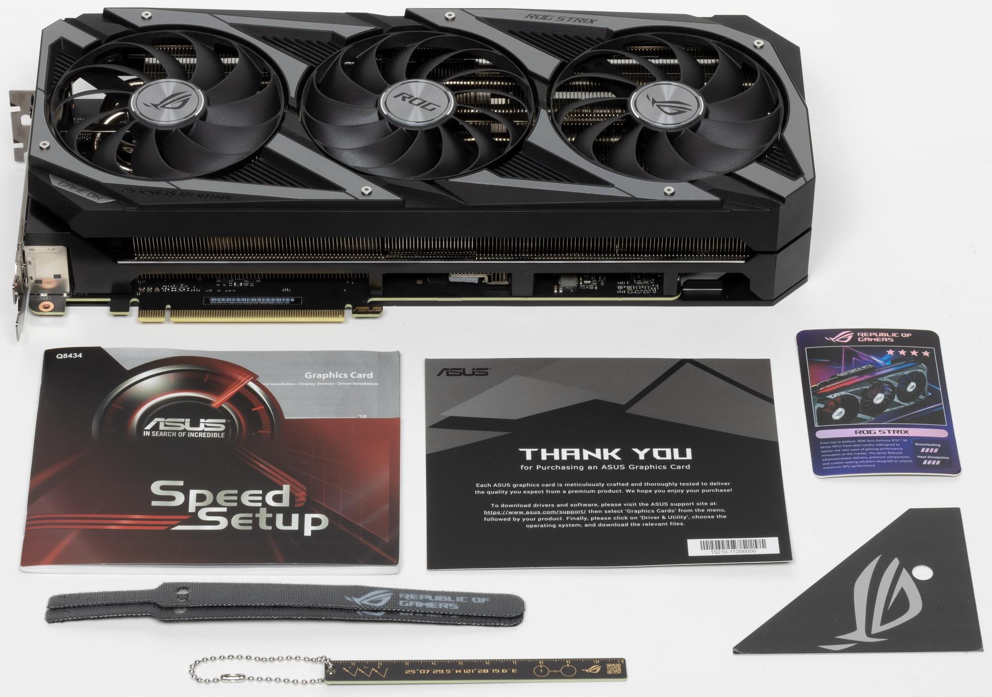 Комплект поставки, кроме традиционного руководства пользователя и карточки ROG, включает мелкие бонусы в виде стяжек и фирменной линейки.