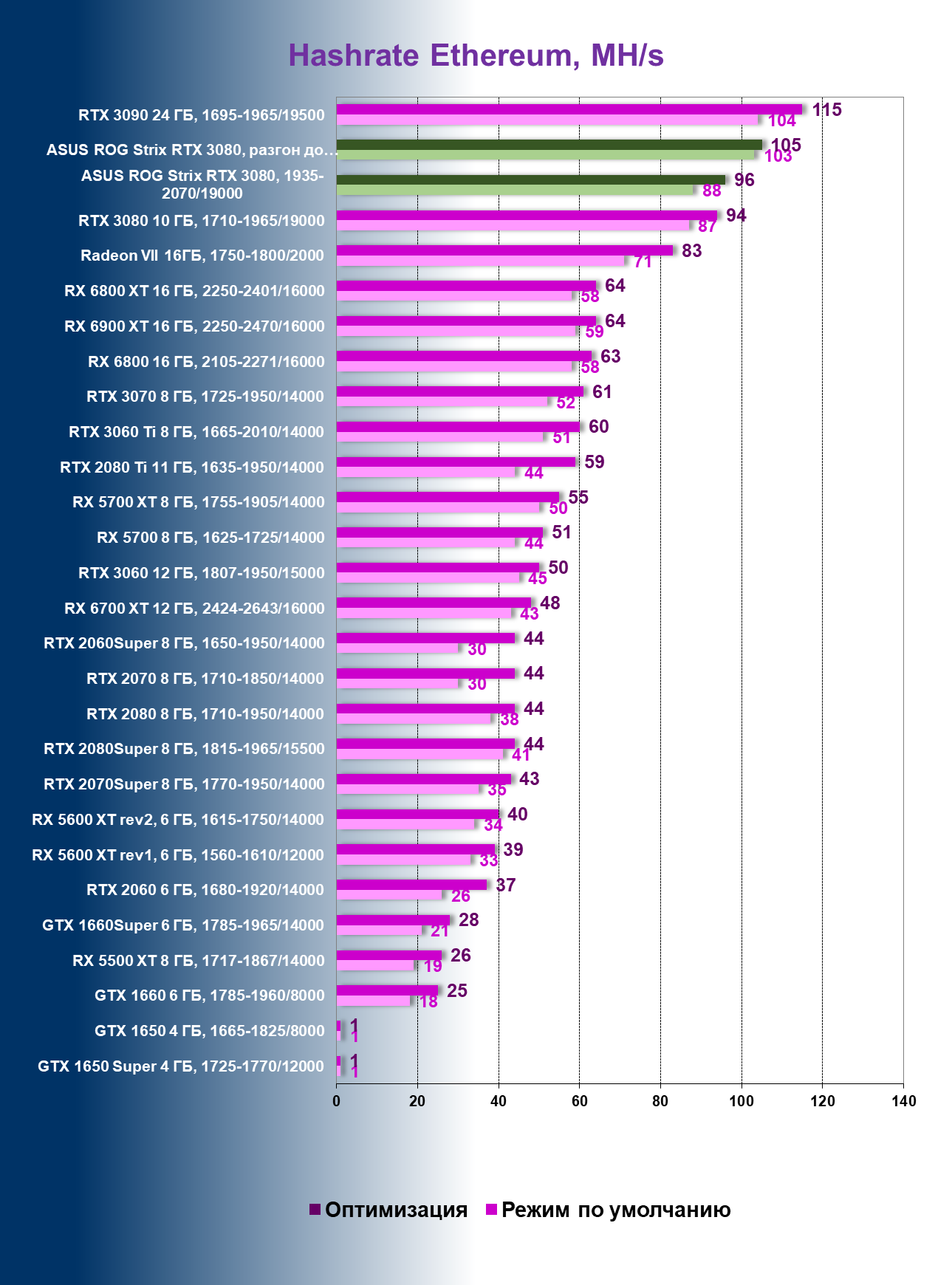 | 04 | Asus ROG Strix RTX 3080, 1935—2070/19000 | 860 | 33 | 259 000 |