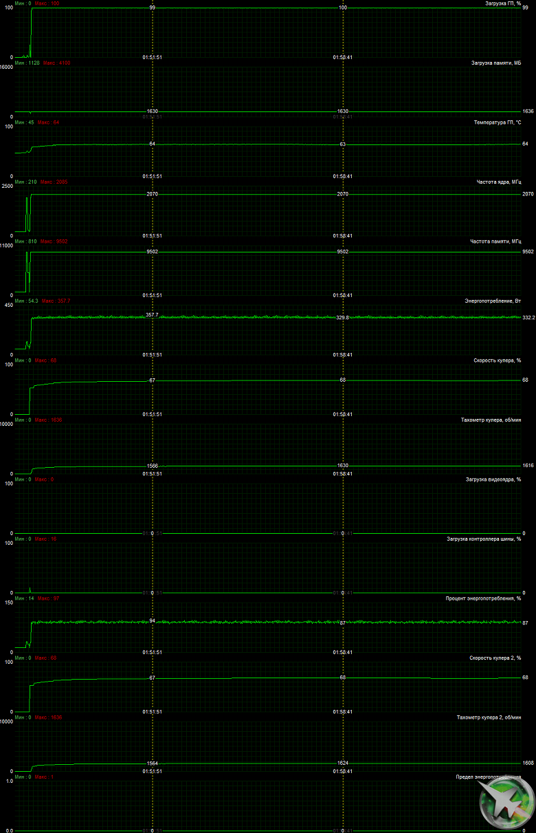 После 6-часового прогона под нагрузкой в OC Mode максимальная температура ядра не превысила 64 градусов, что является великолепным результатом для видеокарт такого уровня. Максимальная мощность была зафиксирована на уровне 358 Вт, а максимальный нагрев наблюдался в центре PCB, и основным источником нагрева являются микросхемы памяти, которые могут нагреваться выше 100 °C.