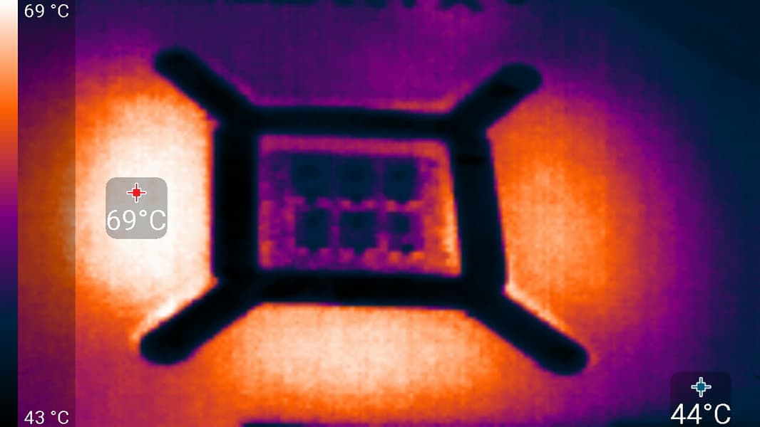 После 6-часового прогона под нагрузкой в OC Mode максимальная температура ядра не превысила 70 градусов, что является хорошим результатом для видеокарт такого уровня. Максимальная мощность была зафиксирована на уровне 429 Вт, а максимальный нагрев наблюдался в центре PCB, и основным источником нагрева являются микросхемы памяти, которые могут нагреваться выше 100 °C.