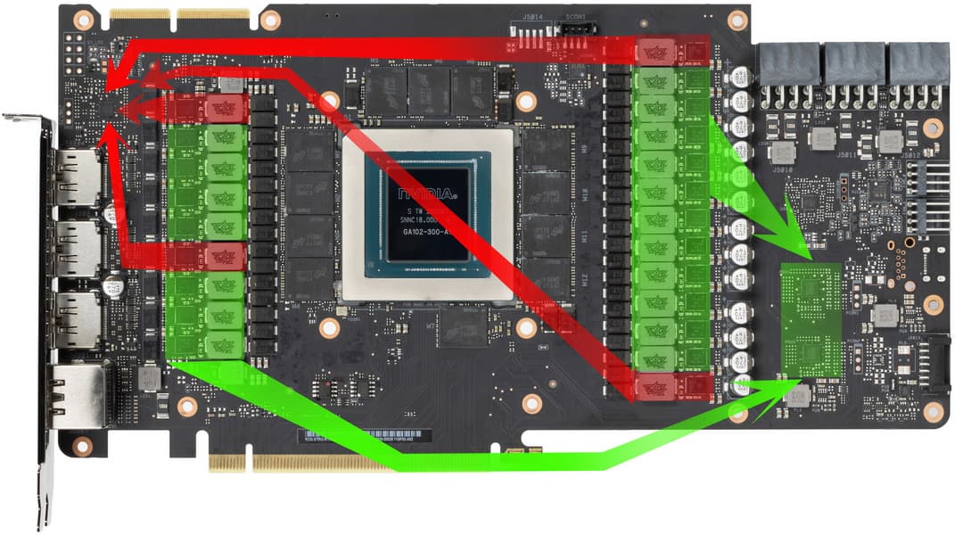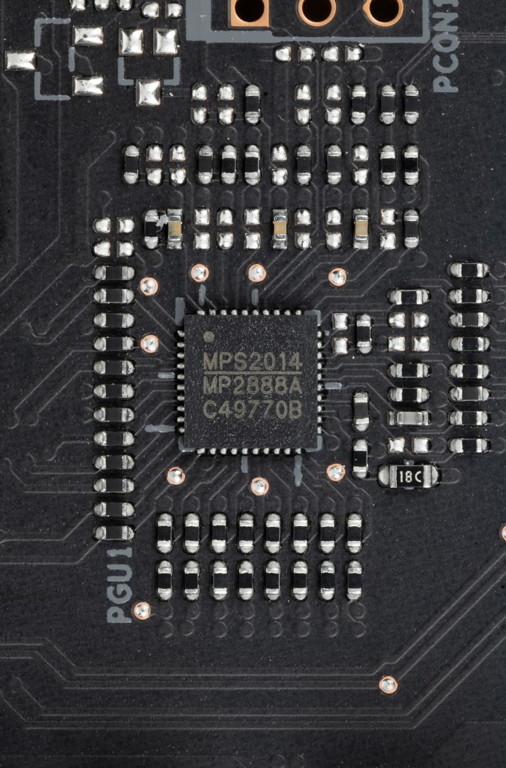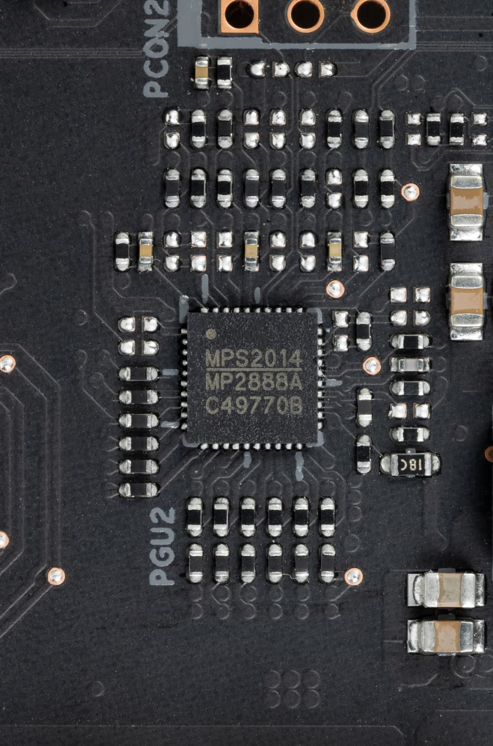 Зеленым цветом отмечена схема питания ядра, красным — памяти. При этом никаких удвоителей (даблеров) фаз нет, для управления схемой питания GPU используются два ШИМ-контроллера MP2888A (Monolith Power Systems), каждый из которых способен управлять максимум 10 фазами (реализовано 9+9). Оба расположены на лицевой стороне платы.