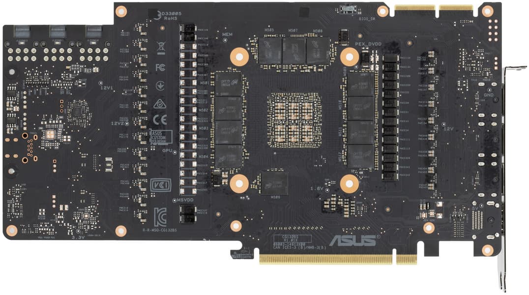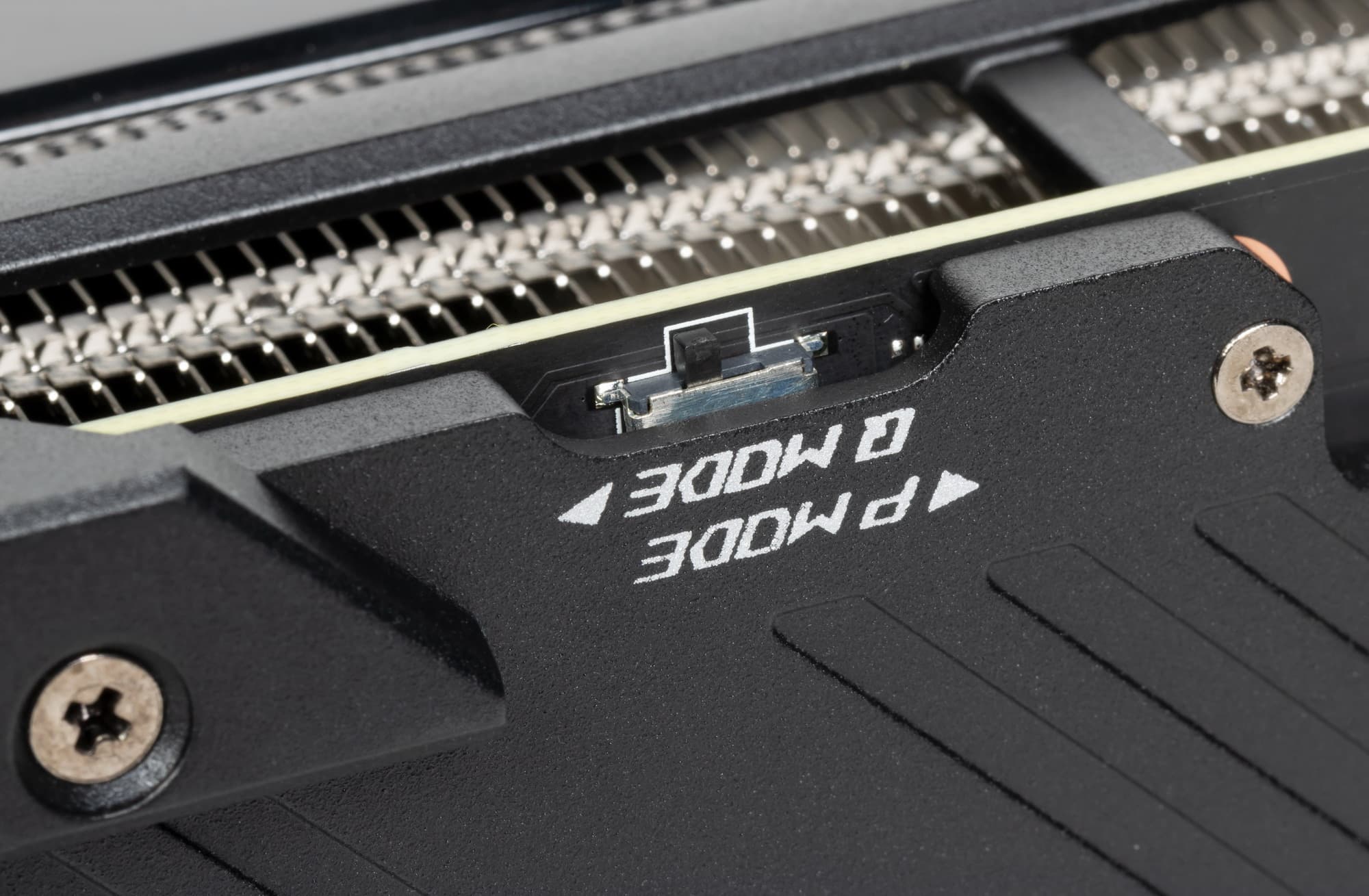 Карта имеет двойной BIOS, что уже традиционно для топовых решений Asus. На торце карты есть переключатель, в разных версиях BIOS (они названы Performance mode и Quiet mode — производительный и тихий режимы) заданы разные кривые работы вентиляторов.