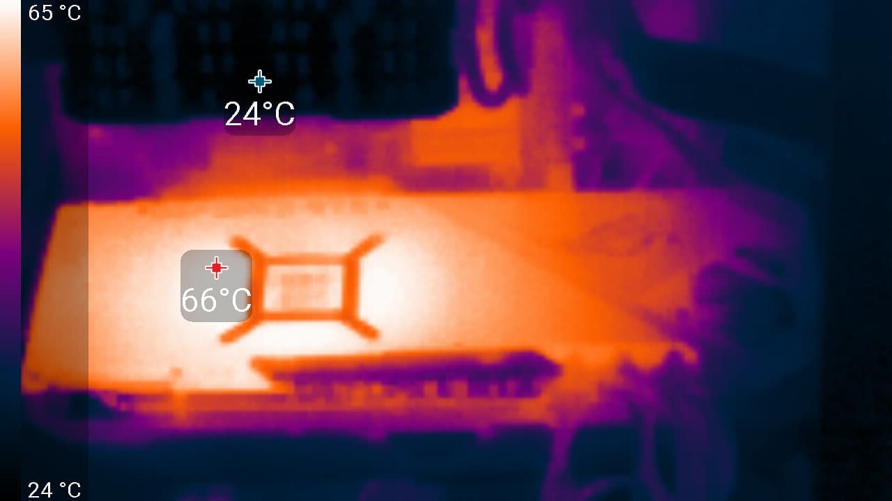 В режиме максимальной нагрузки в 3D температура в Performance Mode достигала 70 °C. Вентиляторы при этом раскручивались до 2230 оборотов в минуту, шум вырастал до 41,7 дБА: это очень громко (но такой шум — расплата за сильно повышенные частоты работы при поднятом лимите потребления). В видеоролике ниже шум фиксировался на пару секунд через каждые 30 секунд.