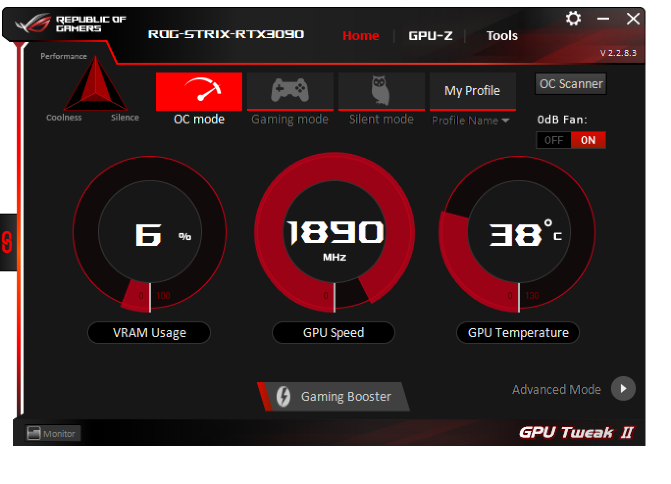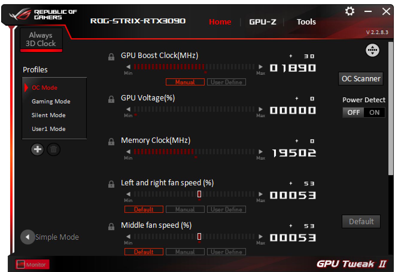 Питание подается через три 8-контактных разъема. Фирменная утилита Asus GPU Tweak II прекрасно работает с этой картой, и именно через нее можно включить фабричный режим OC Mode. Разумеется, есть и возможность ручного разгона.