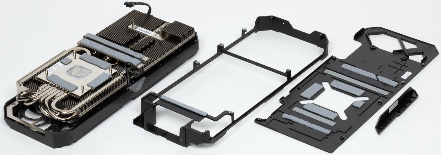 Основой СО является огромный двухсекционный пластинчатый никелированный радиатор с тепловыми трубками, припаянными к подошве прямого контакта с GPU и микросхемами памяти. Этот же радиатор служит охладителем и для компонентов преобразователей питания VRM с помощью небольших подошв. Для остальных мосфетов VRM предусмотрен отдельный радиатор, размещенный на раме, прикрученной к основному радиатору. Задняя пластина выполнена из алюминия с электрозащитным покрытием и имеет двойное предназначение: служит элементом защиты PCB и через термоинтерфейс участвует в охлаждении микросхем памяти на оборотной стороне карты, а также охлаждает зону преобразователей питания.