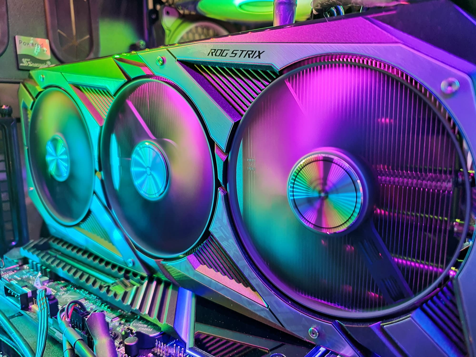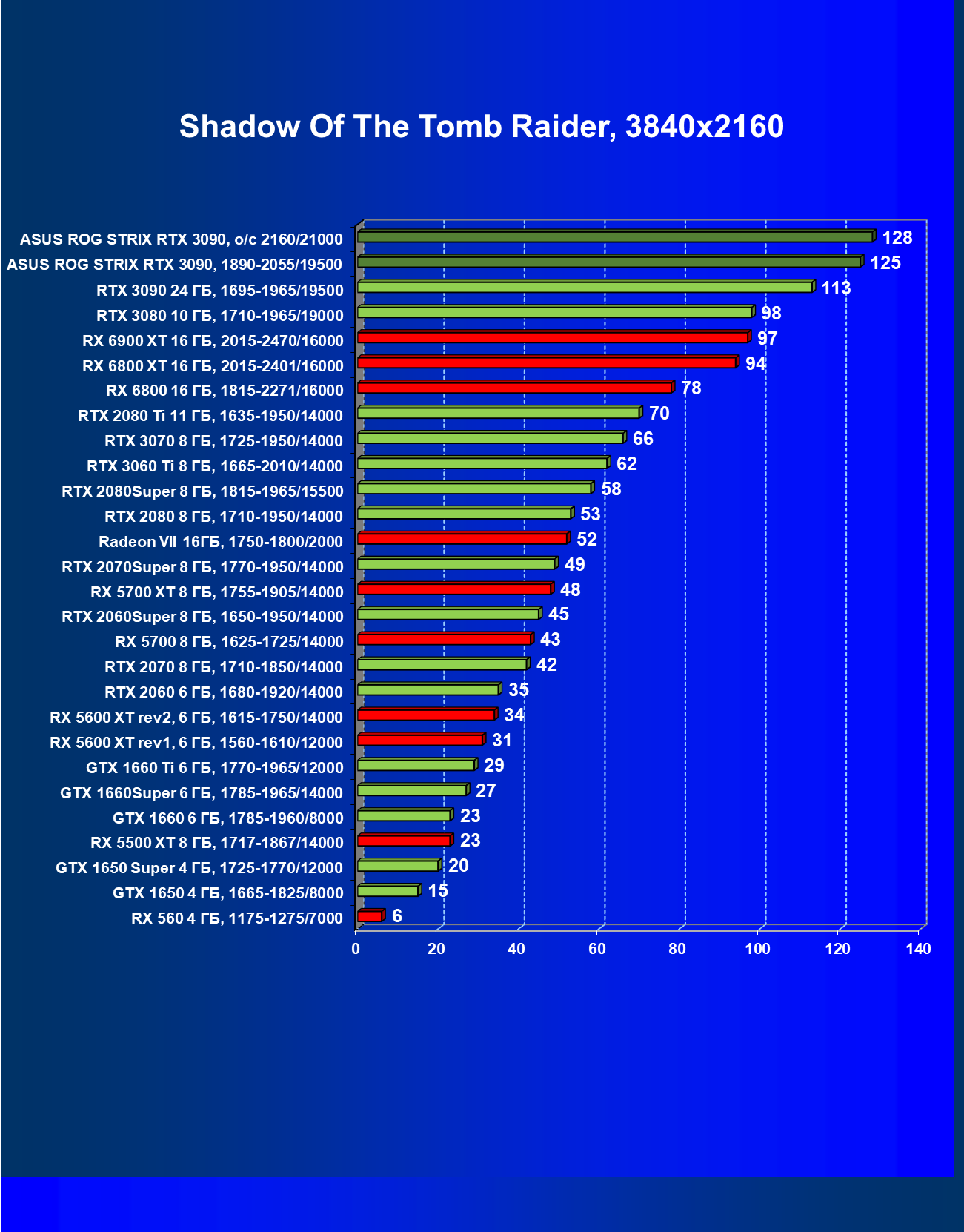 Если взять чистую производительность в играх без использования трассировки лучей и DLSS, то GeForce RTX 3090 оказывается чуть-чуть быстрее Radeon RX 6900 XT, а карта Asus еще быстрее за счет фабричного разгона.