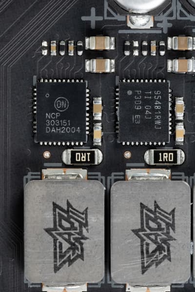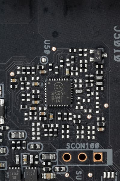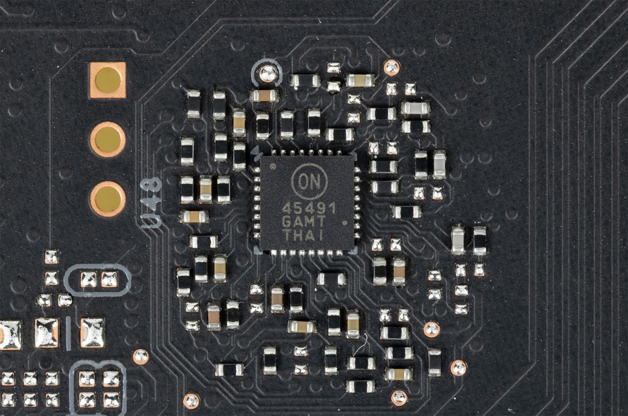 Также есть два контроллера NCP45491 (On Semiconductor), отвечающие за мониторинг карты (слежение за напряжением и температурой). Они расположены на лицевой и оборотной сторонах PCB.