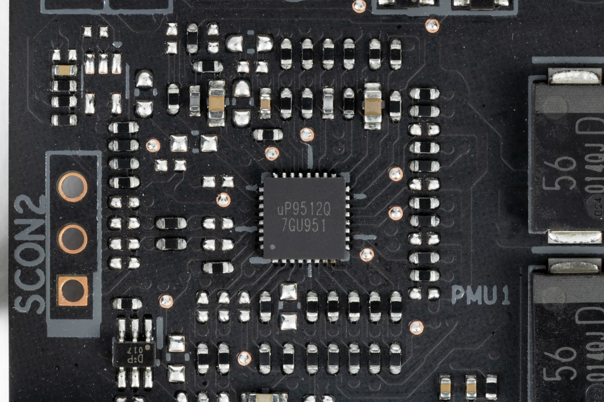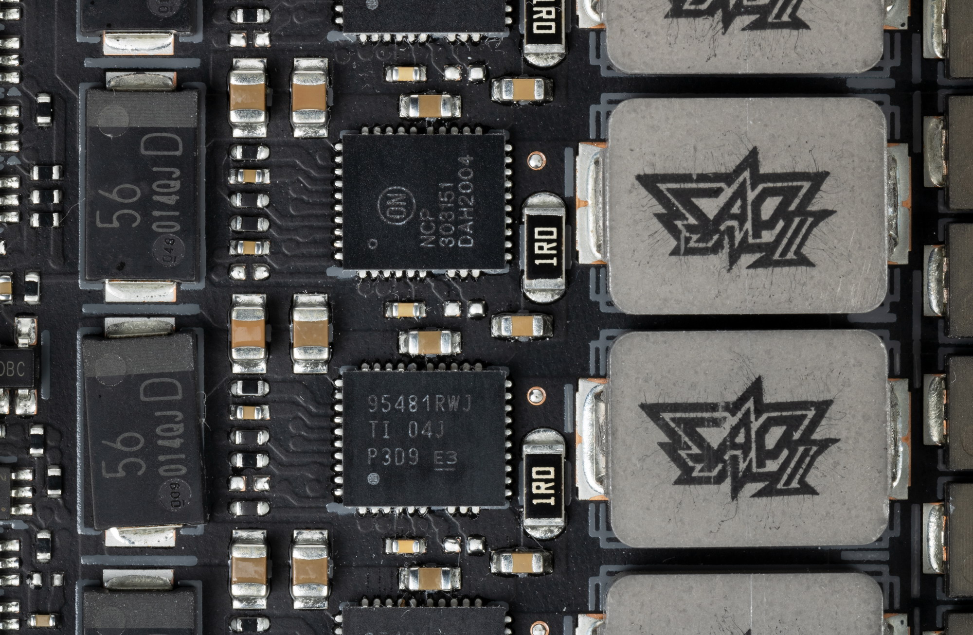 Схема питания ядра у карты Asus традиционно построена с применением технологии Super Alloy Power II, использованы современные твердотельные конденсаторы и транзисторные сборки DrMOS — в данном случае CSD95481RWJ (Texas Instruments), каждая из которых рассчитана максимально на 60 А.