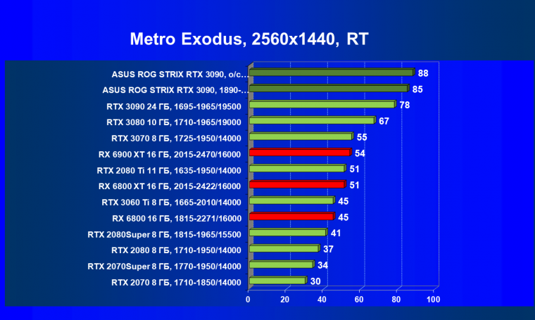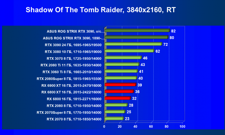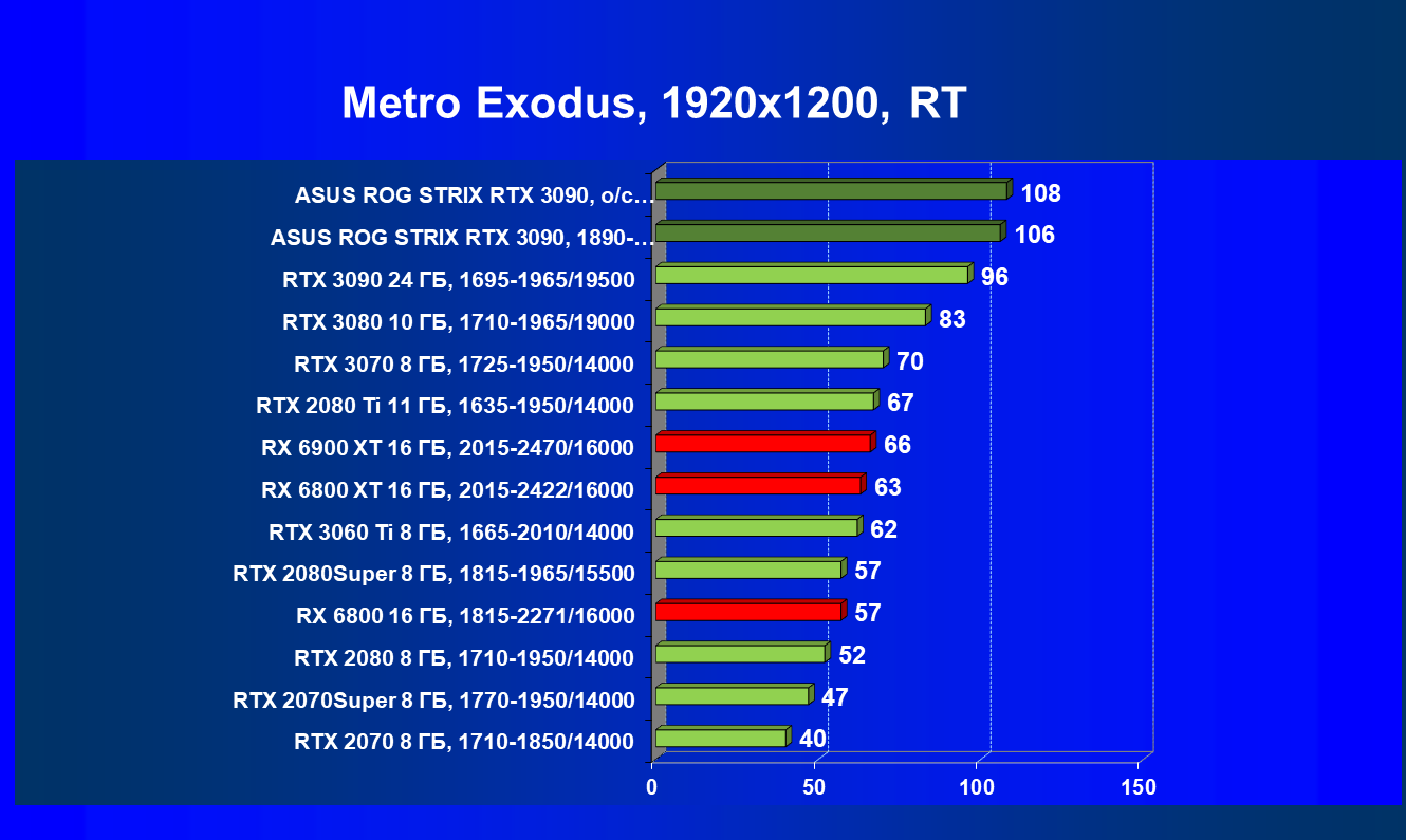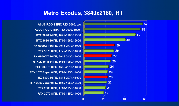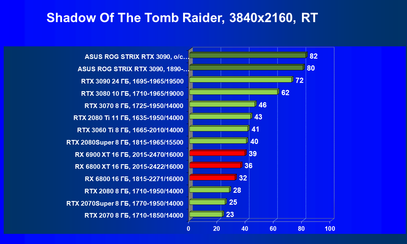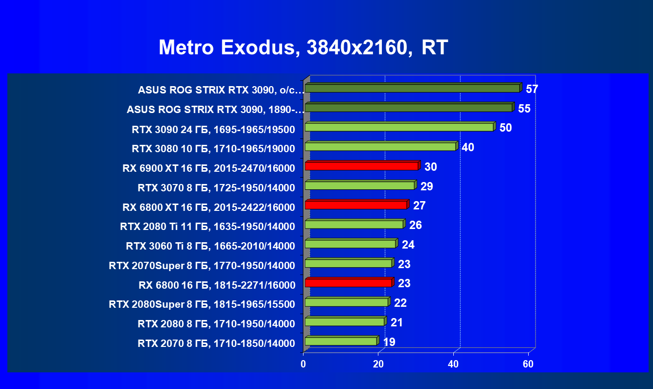 Мы уже знаем, что при включении RT производительность Radeon RX 6900 XT падает намного сильнее, нежели у GeForce RTX 3090, поэтому Radeon RX 6900 XT в рейтинге оказался ниже. Тем не менее, все равно оба конкурента вполне подходят для 4К. Разумеется, карта Asus показала просто рекордный прирост производительности, особенно при ручном разгоне.