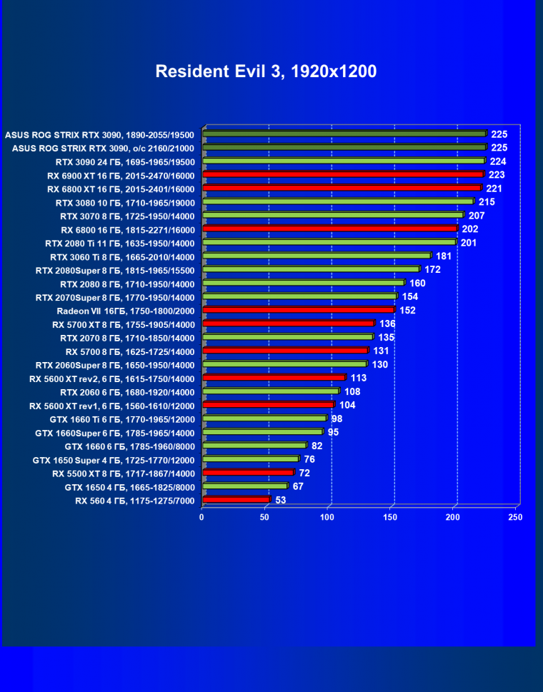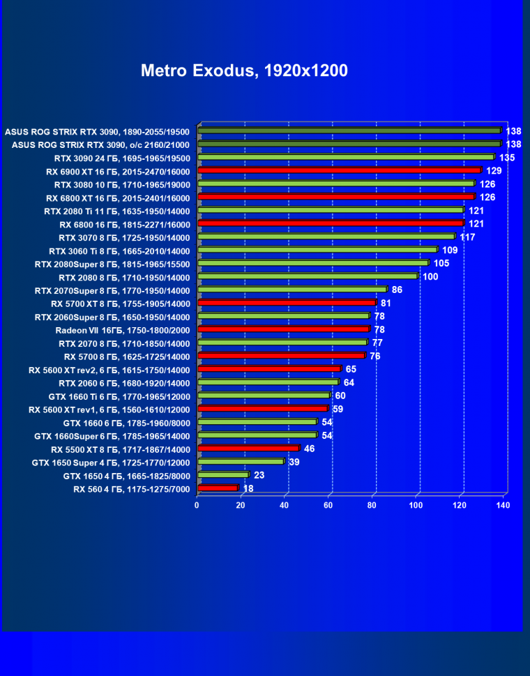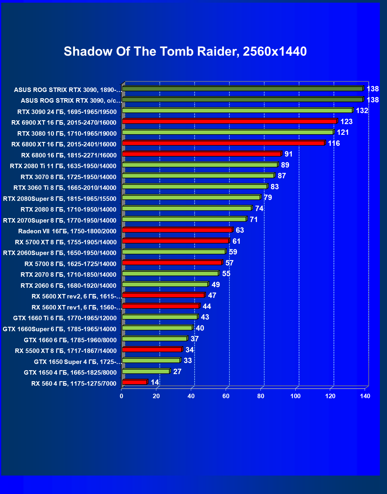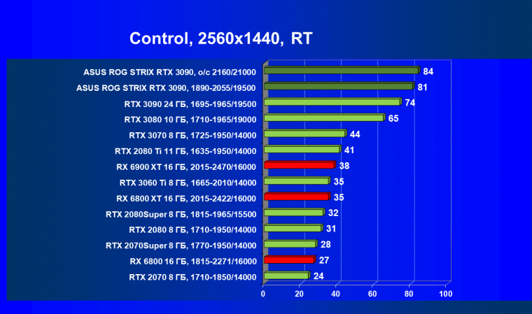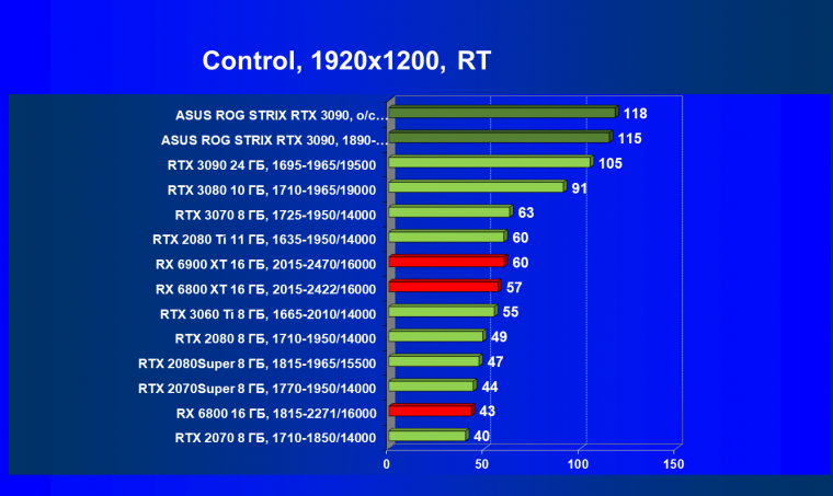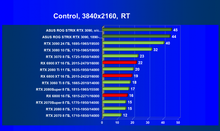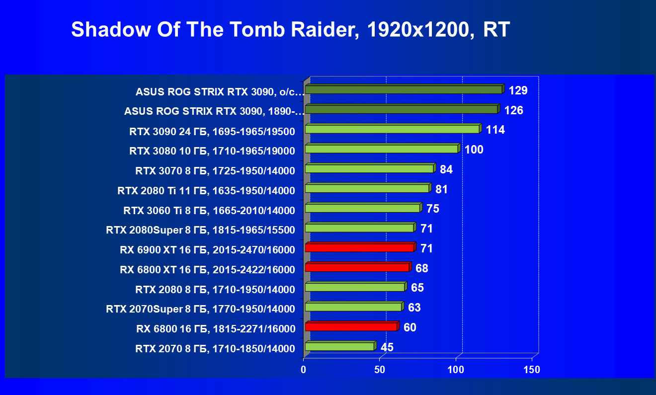 Мы уже знаем, что при включении RT производительность Radeon RX 6900 XT падает намного сильнее, нежели у GeForce RTX 3090, поэтому Radeon RX 6900 XT в рейтинге оказался ниже. Тем не менее, все равно оба конкурента вполне подходят для 4К. Разумеется, карта Asus показала просто рекордный прирост производительности, особенно при ручном разгоне.