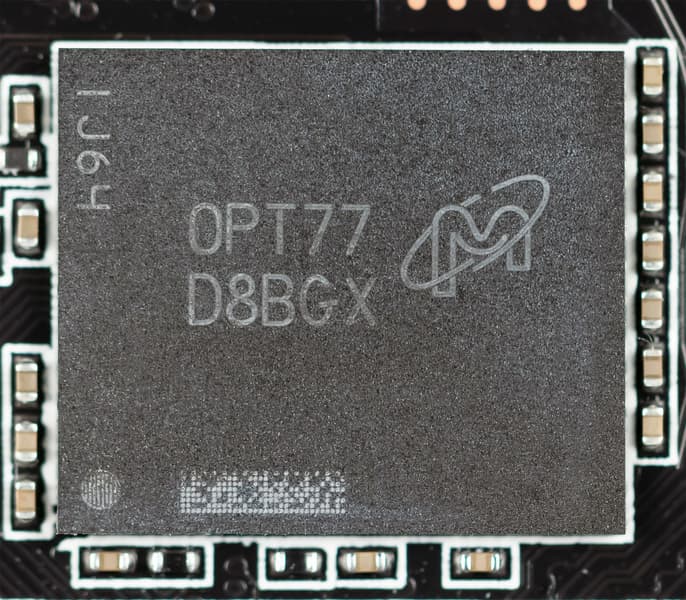 Карта имеет 24 ГБ памяти GDDR6X SDRAM, размещенной в 24 микросхемах по 8 Гбит на обеих сторонах PCB (по 12 на каждой). Микросхемы памяти Micron (GDDR6X, MT61K256M32JE-21) рассчитаны на номинальную частоту работы в 5250 (21000) МГц. Расшифровщик кодов на упаковках FBGA находится здесь.