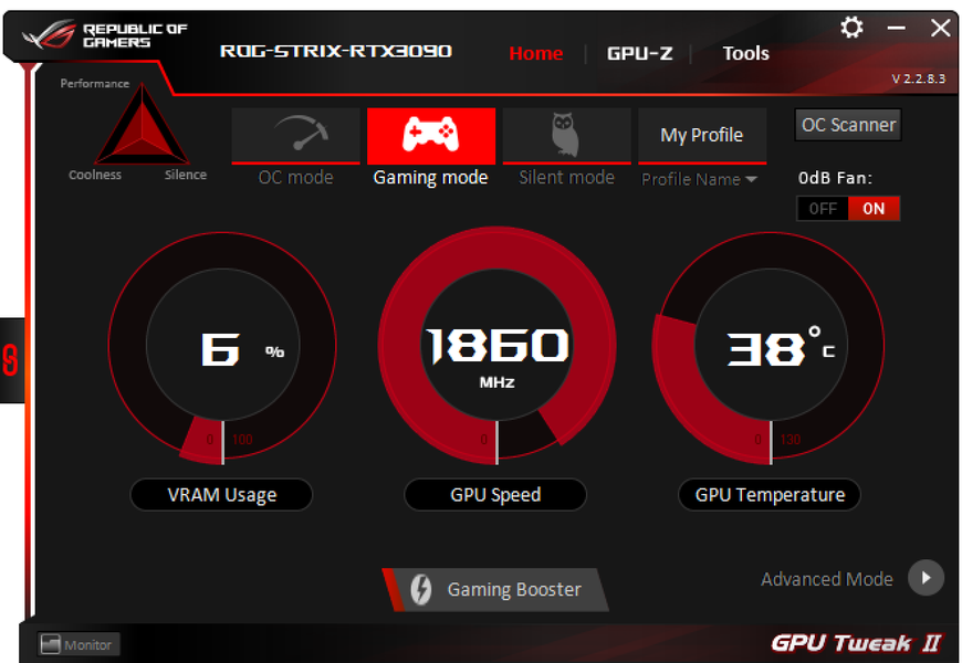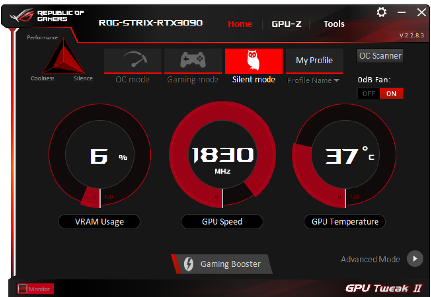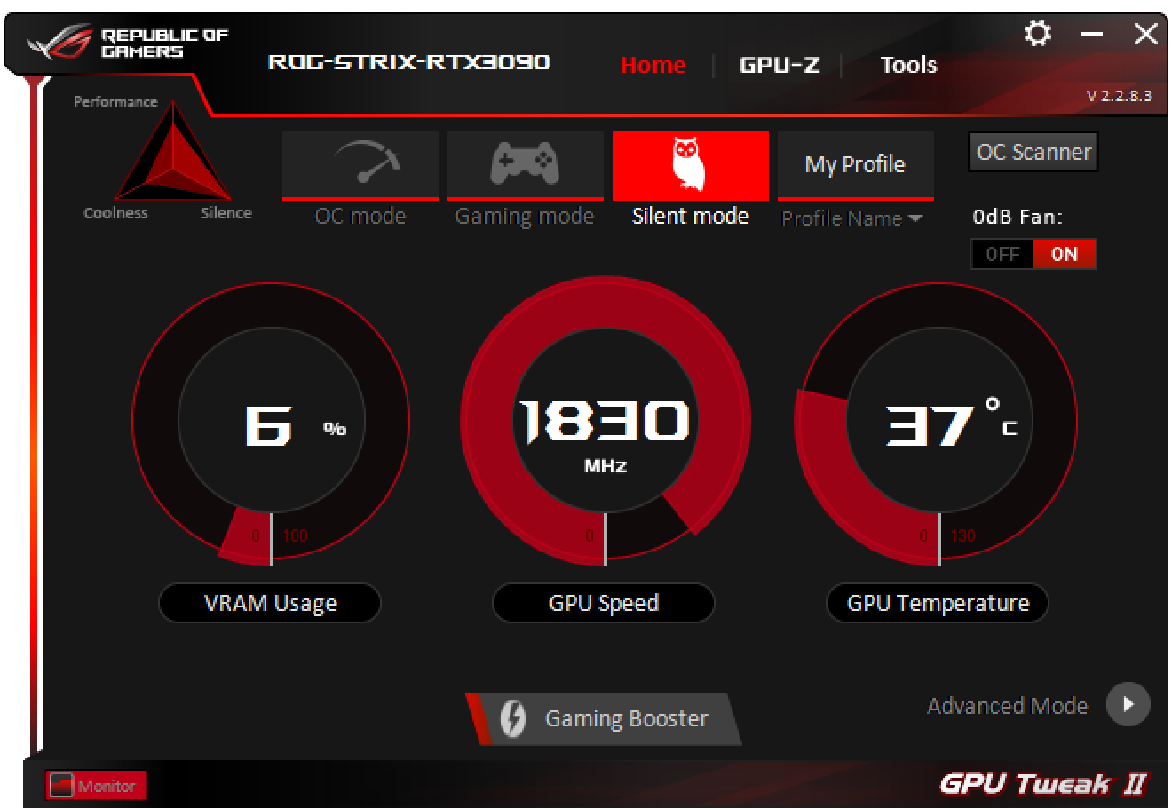 В простое режимы Performance Mode и Quiet Mode совершенно не отличались: в 2D температура была не выше 38 °C, вентиляторы не работали, уровень шума был равен фоновому — 18 дБА. Кстати, для этого потребовалось обновить BIOS, потому что при той версии BIOS, с которой мы получили карту, вентиляторы работали постоянно.