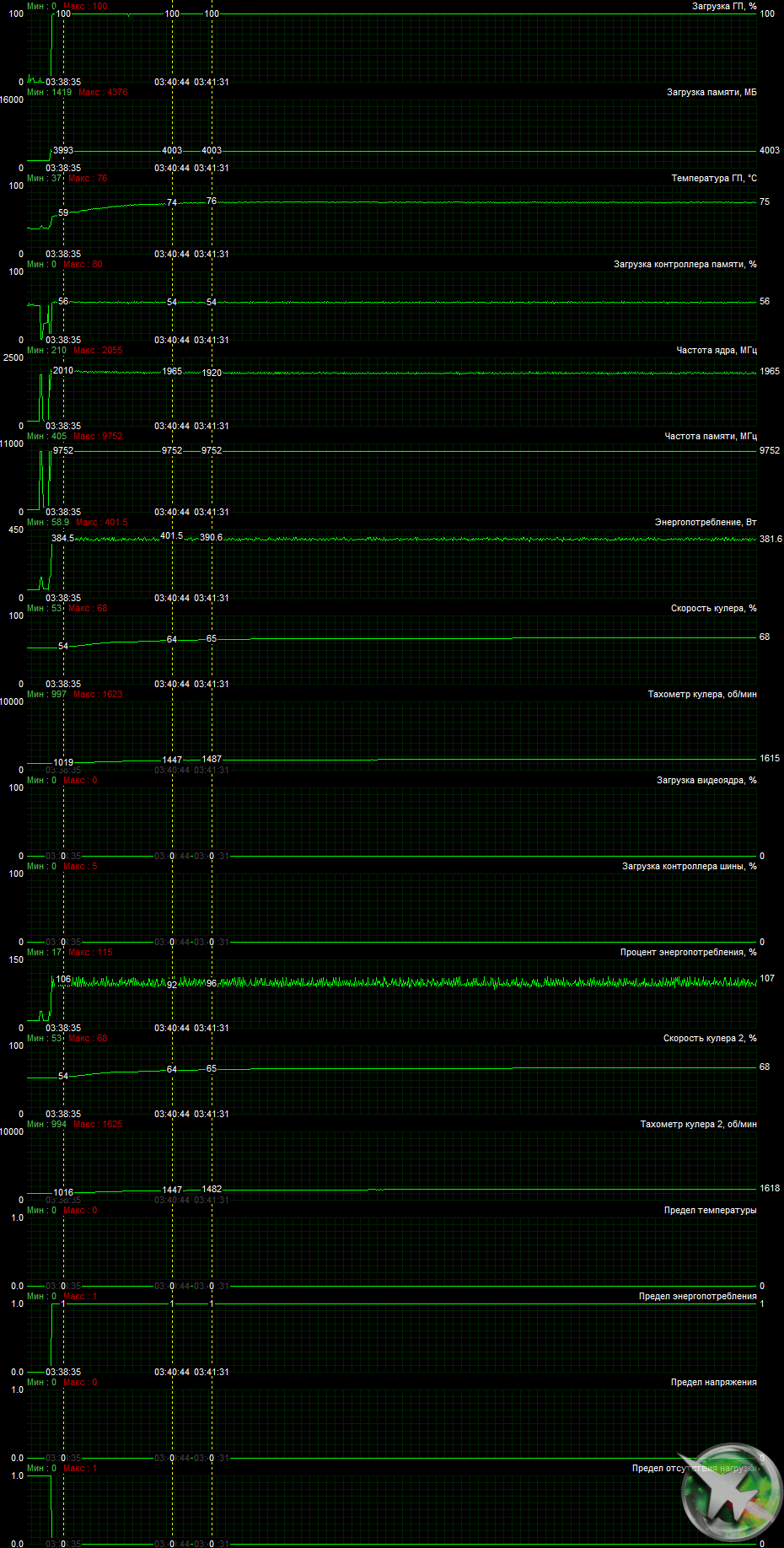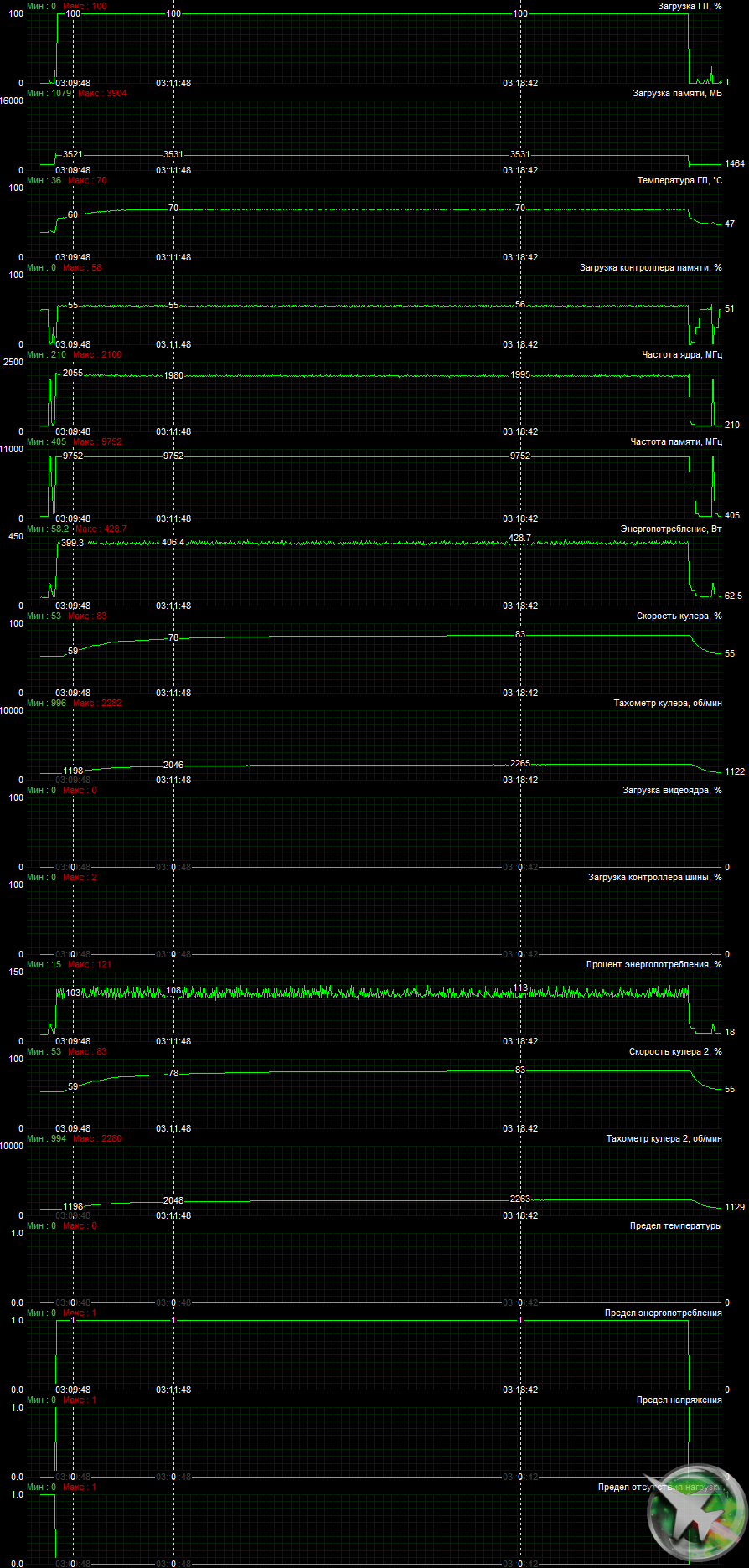 При описанном ручном разгоне параметры работы карты особо не менялись, однако максимальное потребление выросло до 483 Вт.