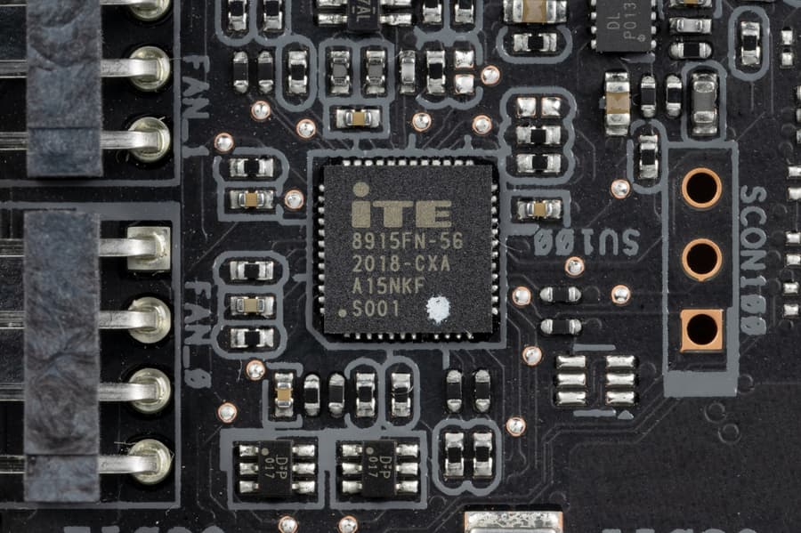 Как и у всей серии видеокарт ROG, у этой платы в хвостовой части имеются два коннектора для подключения корпусных вентиляторов, которые будут работать в соответствии с нагревом видеокарты, и за это отвечает контроллер IT8915FN (ITE).