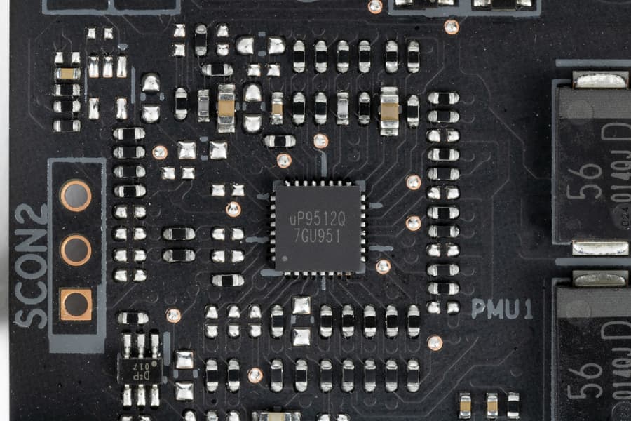 На той же стороне имеется ШИМ-контроллер uPI Semiconductor uP9512Q, который управляет 4-фазной схемой питания микросхем памяти.