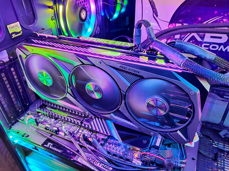 Подсветка у карты реализована на верхнем торце, во вставках около вентиляторов и в логотипе ROG, встроенном в заднюю пластину.